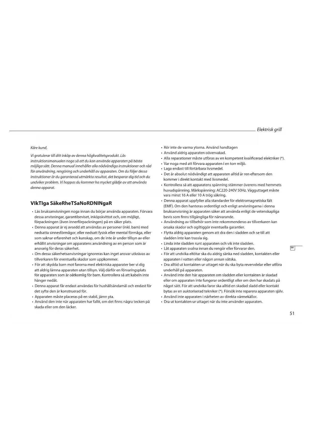 - Använd inte under några omständigheter kol eller annat fast eller ytande bränsle för att elda i grillen. (*) Kompetent kvalicerad elektriker: tillverkarens eller importörens kundtjänst eller en kvalicerad, godkänd och kompetent person som kan utföra den här typen av reparationer utan att utsätta sig själv eller andra för faror. Lämna alltid in apparaten till den elektrikern.