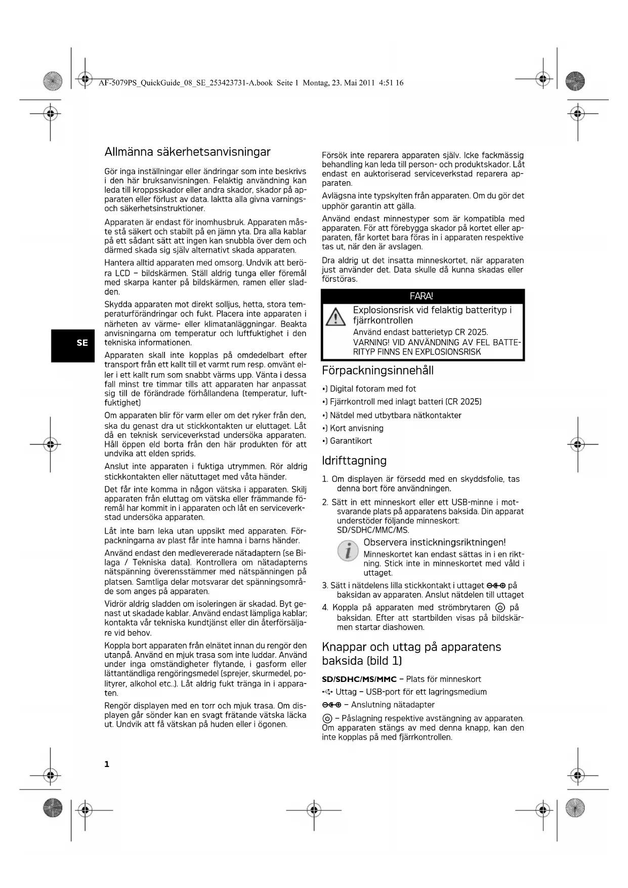 Observera instickningsriktningen! Minneskortet kan endast sättas in i en rikt- ning. Stick inte in minneskortet med våld i uttaget. AF-5079PS_QuickGuide_08_SE_253423731-A.book Seite 1 Montag, 23. Mai 2011 4:51 162