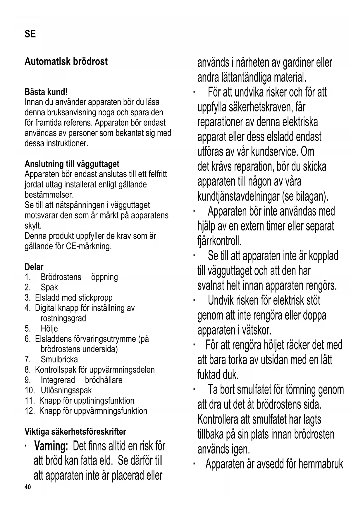 Viktiga säkerhetsföreskrifter ∙ Varning: Det fi nns alltid en risk för att bröd kan fatta eld. Se därför till att apparaten inte är placerad eller används i närheten av gardiner eller andra lättantändliga material. ∙ För att undvika risker och för att uppfylla säkerhetskraven, får reparationer av denna elektriska apparat eller dess elsladd endast utföras av vår kundservice. Om det krävs reparation, bör du skicka apparaten till någon av våra kundtjänstavdelningar (se bilagan). ∙ Apparaten bör inte användas med hjälp av en extern timer eller separat fjärrkontroll. ∙ Se till att apparaten inte är kopplad till vägguttaget och att den har svalnat helt innan apparaten rengörs. ∙ Undvik risken för elektrisk stöt genom att inte rengöra eller doppa apparaten i vätskor. ∙ För att rengöra höljet räcker det med att bara torka av utsidan med en lätt fuktad duk. ∙ Ta bort smulfatet för tömning genom att dra ut det åt brödrostens sida. Kontrollera att smulfatet har lagts tillbaka på sin plats innan brödrosten används igen. ∙ Apparaten är avsedd för hemmabruk SE41 eller liknande användning, såsom - i personalkök, kontor och andra kommersiella miljöer, - i företag inom jordbrukssektorn, - för gäster i hotell, motell och liknande inkvarteringsställen, - för gäster i bed-and-breakfast hus. ∙ Denna apparat kan användas av barn (minst 8 år gamla) och av personer som har minskad fysisk rörelseförmåga, reducerat sinnes- eller mentaltillstånd, eller som har bristfällig erfarenhet och kunskap, förutsatt att dessa personer är under uppsyn eller har fått tillräckliga instruktioner beträffande apparatens användning och vet vilka risker och säkerhetsåtgärder som användningen innefattar. ∙ Barn bör inte tillåtas leka med apparaten. ∙ Barn bör inte tillåtas rengöra eller göra service på apparaten ifall de inte är övervakade och minst 8 år gamla. ∙ Apparaten och dess elsladd bör hållas utom räckhåll för barn under 8 år. ∙ Varning: Håll barn på avstånd från apparatens förpackningsmaterial eftersom fara eventuellt kan uppstå. Det fi nns t.ex. risk för kvävning. ∙ Placera alltid apparaten på en vågrät och värmebeständig yta. ∙ Undvik skador på höljet genom att inte placera apparaten på eller i närheten av heta källor eller öppen eld, såsom heta plattor eller gaslågor. ∙ Varning: De ytor i höljet som man kommer åt kan bli mycket heta under användningen. Brännskador kan uppstå om man rör de heta delarna. ∙ Kontrollera noga om apparaten skadats innan du tar den i användning. Om apparaten t.ex. har tappats på en hård yta, eller om elsladden utsatts för våldsam kraft, får den inte längre användas. Även osynliga skador kan försämra apparatens driftsäkerhet. ∙ Se till att sladden inte kommer i kontakt med heta ytor. ∙ Låt inte sladden hänga fritt. ∙ Apparaten bör alltid vara under uppsikt när den är i användning. ∙ Täck inte över brödrostens öppning när apparaten är i bruk. ∙ Försök inte avlägsna bröd ur brödrosten med fi ngrarna och sätt inga föremål, såsom knivar, gaffl ar etc., i brödrostens öppning. Värmeelementen är spänningsförande. ∙ Dra alltid stickproppen ur vägguttaget - efter användning, - ifall apparaten skulle krångla, - innan apparaten rengörs. ∙ Ta stickproppen ur vägguttaget genom att dra i stickproppen, aldrig i sladden. ∙ Inget ansvar godtas om skada uppkommer till följd av felaktig användning, eller om dessa instruktioner42 inte följts. Användning Allmän information ∙ Varning: Startspaken kan låsas i nertryckt läge enbart när stickproppen är isatt. ∙ Använd inte brödskivor som är för tjocka eller för stora, eftersom de kan fastna i brödrosten. Skivornas tjocklek borde inte överskrida 14 mm. ∙ Dra alltid stickproppen ur vägguttaget ifall brödrosten skadats samt före rengöring. ∙ Om en brödskiva fastnat i brödrosten tas den bort med ett trubbigt träredskap. Vidrör aldrig värmeelementen av metall. Innan den första användningen ∙ Rengör brödrosten noggrant (se Skötsel och rengöring). ∙ Koppla på brödrosten och genomför åtminstone fem omgångar med maximal rostningsinställning utan att lägga i något bröd. ∙ Låt brödrosten svalna mellan rostningarna. ∙ När brödrosten kopplas på för första gången kan den avge en lätt lukt och en aning rök, som kommer att försvinna efter en kort stund. Vädra därför ordentligt genom att öppna fönster eller balkongdörrar. Automatisk avstängning Denna apparat har en automatisk avstängningsfunktion. Om en brödskiva fastnar och inte kommer upp efter en rostningsomgång är klar, kommer brödrosten att stängas av automatiskt. Om detta händer bör du dra stickproppen ur eluttaget och ta bort brödskivan enligt beskrivningen i avsnittet Allmän information. Så ställs rostningstiden in Den önskade rostningsgraden kan justeras med den digitala inställningsknappen när funktionsspaken har tryckts ner. Ljusrostning: nivåerna 1-3 Mörkrostning: nivåerna 5-7 Om det skivade brödet är speciellt avsett för rostning, rekommenderar vi att du använder rostningsinställning 4. Den senast valda rostningsgraden sparas för nästa rostningsomgång. Användning ∙ Sätt stickproppen i vägguttaget. ∙ Lägg brödet i brödrostens öppning och tryck ner funktionsspaken. ∙ Funktionsspakens och de tre funktionsknapparnas signallampor börjar blinka och blinkandet upphör då signallamporna för utlösningsspakens (