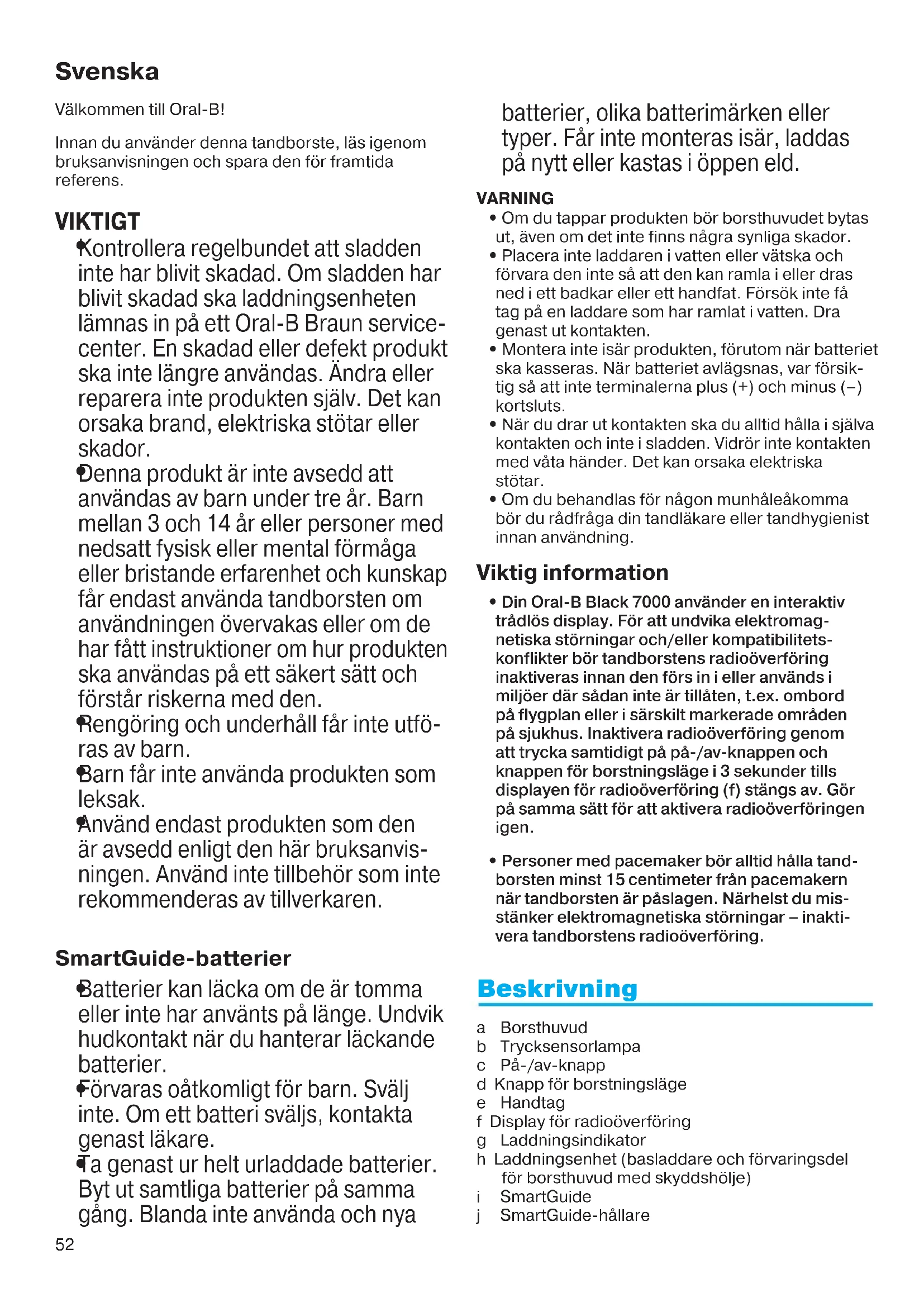 - Din Oral-B Black 7000 använder en interaktiv trådlös display. För att undvika elektromag- netiska störningar och/eller kompatibilitets- konflikter bör tandborstens radioöverföring inaktiveras innan den förs in i eller används i miljöer där sådan inte är tillåten, t.ex. ombord på flygplan eller i särskilt markerade områden på sjukhus. Inaktivera radioöverföring genom att trycka samtidigt på på-/av-knappen och knappen för borstningsläge i 3 sekunder tills displayen för radioöverföring (f) stängs av. Gör på samma sätt för att aktivera radioöverföringen igen.