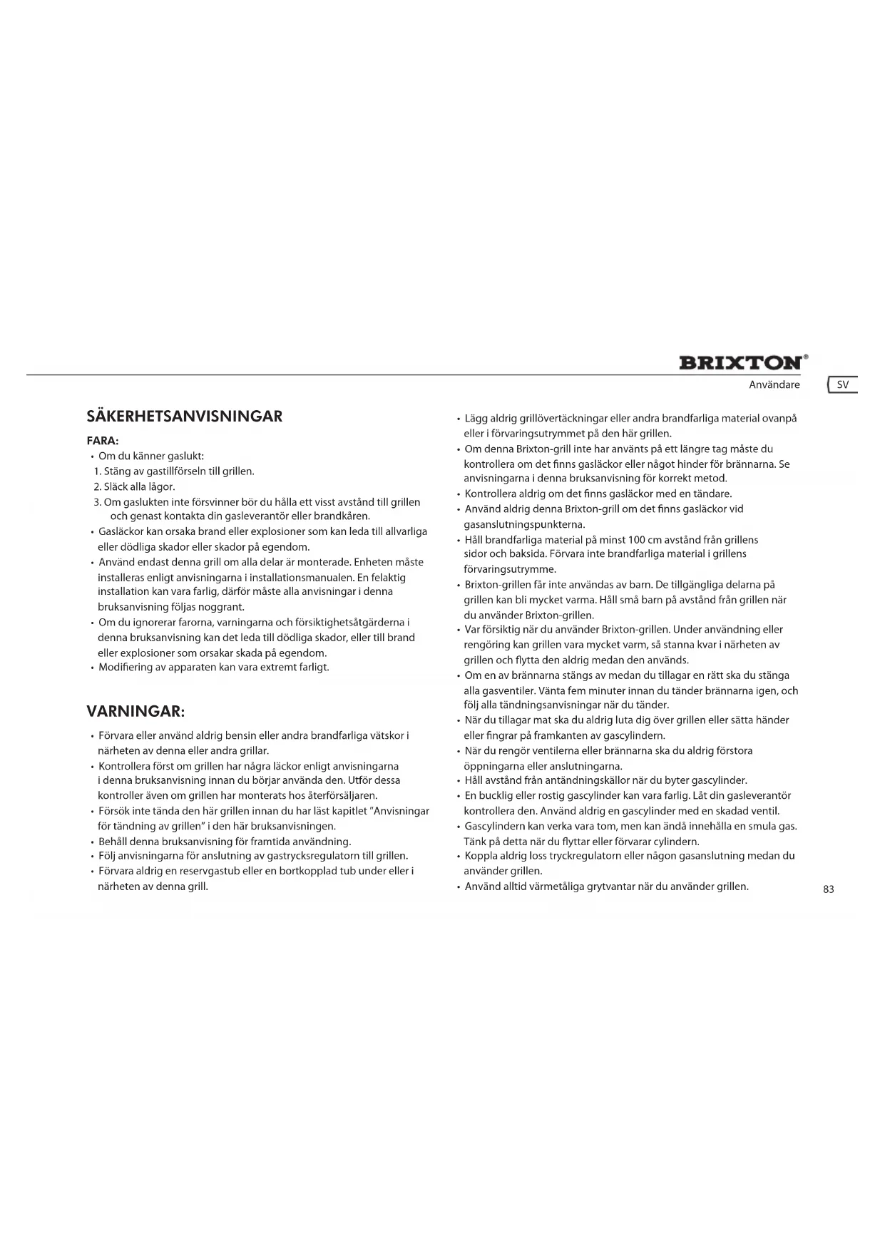- Fettuppsamlingskärlet på framsidan kan bli varmt. Försök inte ta av det förrän det har svalnat. ej lÄMplig FÖr koMMersiell anVÄnDning! sÄkerhetsinForMation: Varning: Den här grillen är konstruerad för att användas enbart med den typ av gas som anges på typskylten. Använd aldrig grillen med någon annan typ av gas. Följer du inte denna varning kan det leda till brandfara och personskador. Dessutom gör det garantin ogiltig. Varning: Förvara aldrig reservgascylindrar under eller i närheten av grillen. Fyll inte på gascylindern till mer än 80 %, och om denna information inte iakttas noggrant kan det leda till brand som i sin tur kan orsaka dödliga eller allvarliga skador. Varning: Håll strömkablar och bränsleslangar borta från varma ytor. Varning: Placera aldrig Brixton-grillen under ett värmetåligt skydd eller solskydd. Varning: Denna grill är inte avsedd för installation eller placering i husbil/husvagn, den är inte heller avsedd för installation i eller på båt. Varning: För din egen säkerhet ska du aldrig förvara bensin eller andra brännbara gaser eller vätskor i närheten av denna eller andra grillar. Om du inte iakttar denna varning kan det leda till brand, explosioner och personskador. VÅrD oCh UnDerhÅll UnDerhÅll: