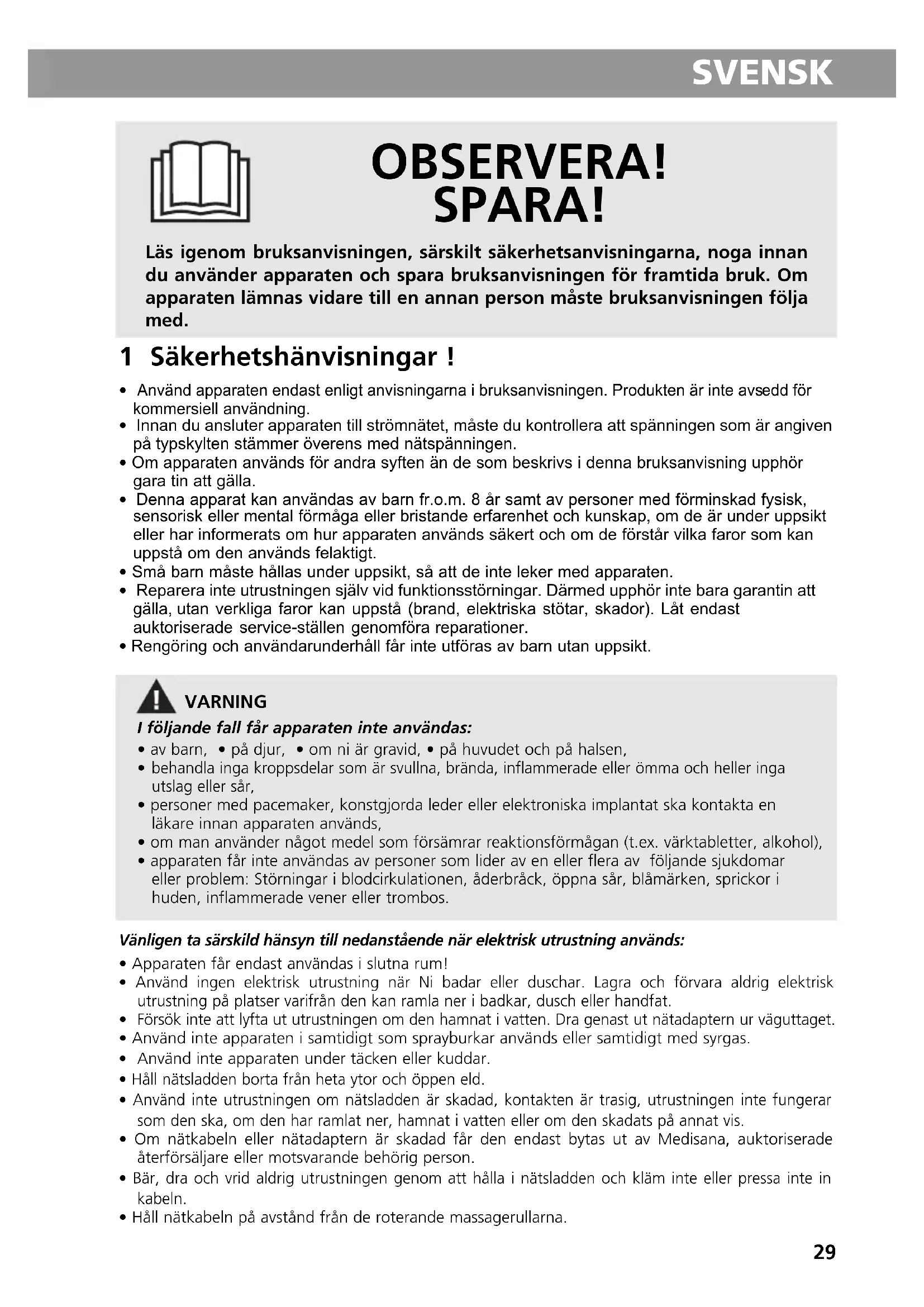 nternet: www.medisana.de Huolto-osoite löytyy erillisestä liitelehtisestä.29 OBSERVERA! SPARA! Läs igenom bruksanvisningen, särskilt säkerhetsanvisningarna, noga innan du använder apparaten och spara bruksanvisningen för framtida bruk. Om apparaten lämnas vidare till en annan person måste bruksanvisningen följa med. SVENSK 1 Säkerhetshänvisningar !