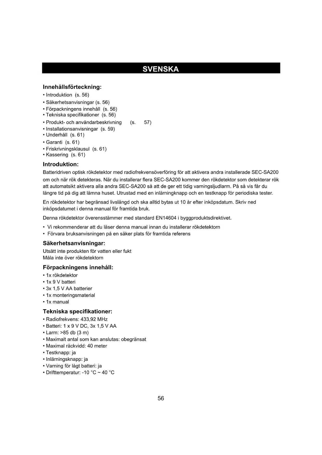 - Kassering (s. 61) Introduktion: Batteridriven optisk rökdetektor med radiofrekvensöverföring för att aktivera andra installerade SEC-SA200 om och när rök detekteras. När du installerar flera SEC-SA200 kommer den rökdetektor som detekterar rök att automatsikt aktivera alla andra SEC-SA200 så att de ger ett tidig varningsljudlarm. På så vis får du längre tid på dig att lämna huset. Utrustad med en inlärningknapp och en testknapp för periodiska tester. En rökdetektor har begränsad livslängd och ska alltid bytas ut 10 år efter inköpsdatum. Skriv ned inköpsdatumet i denna manual för framtida bruk. Denna rökdetektor överensstämmer med standard EN14604 i byggproduktsdirektivet.