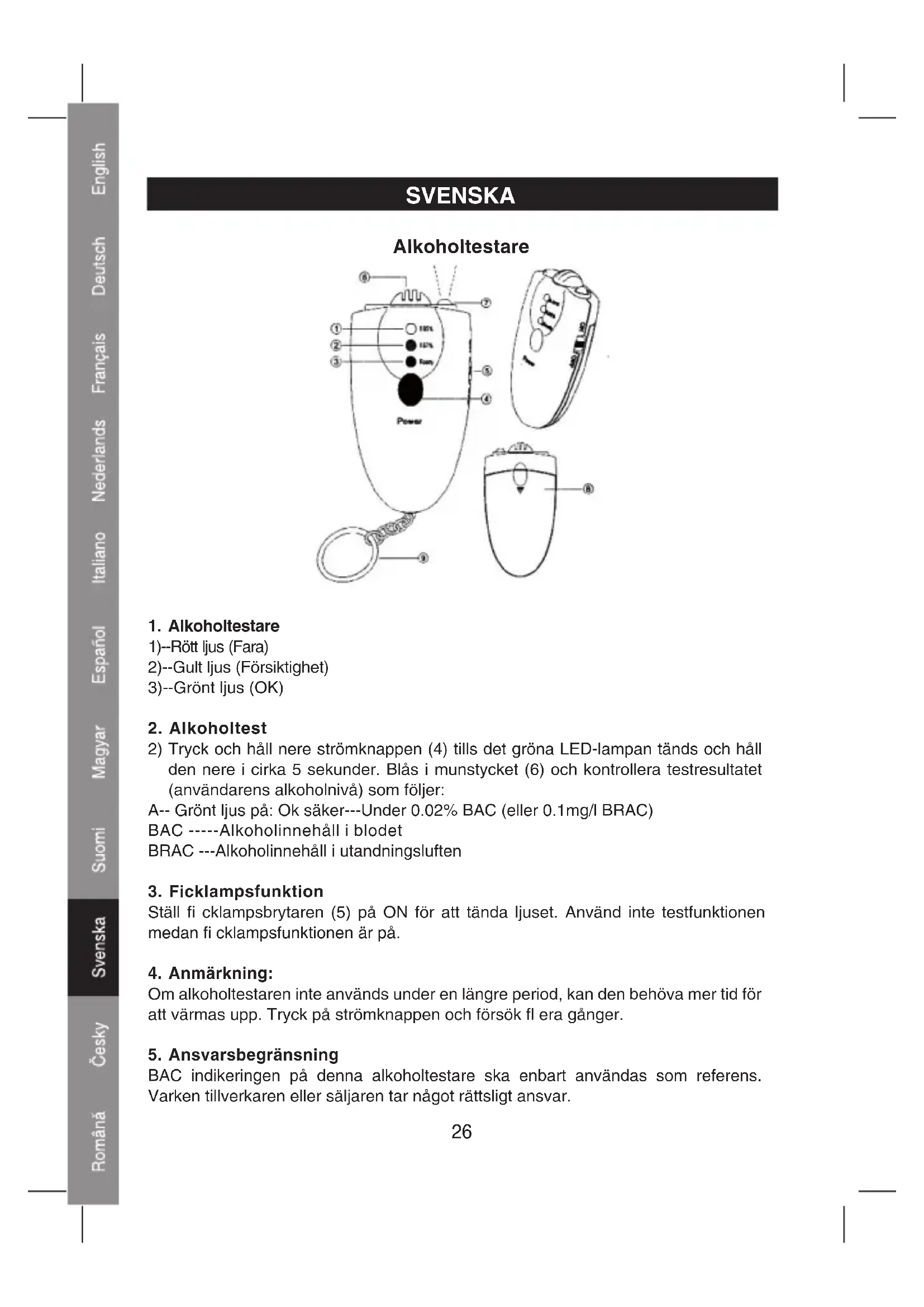 BAC indikeringen på denna alkoholtestare ska enbart användas som referens. Varken tillverkaren eller säljaren tar något rättsligt ansvar. Alkoholtestare27