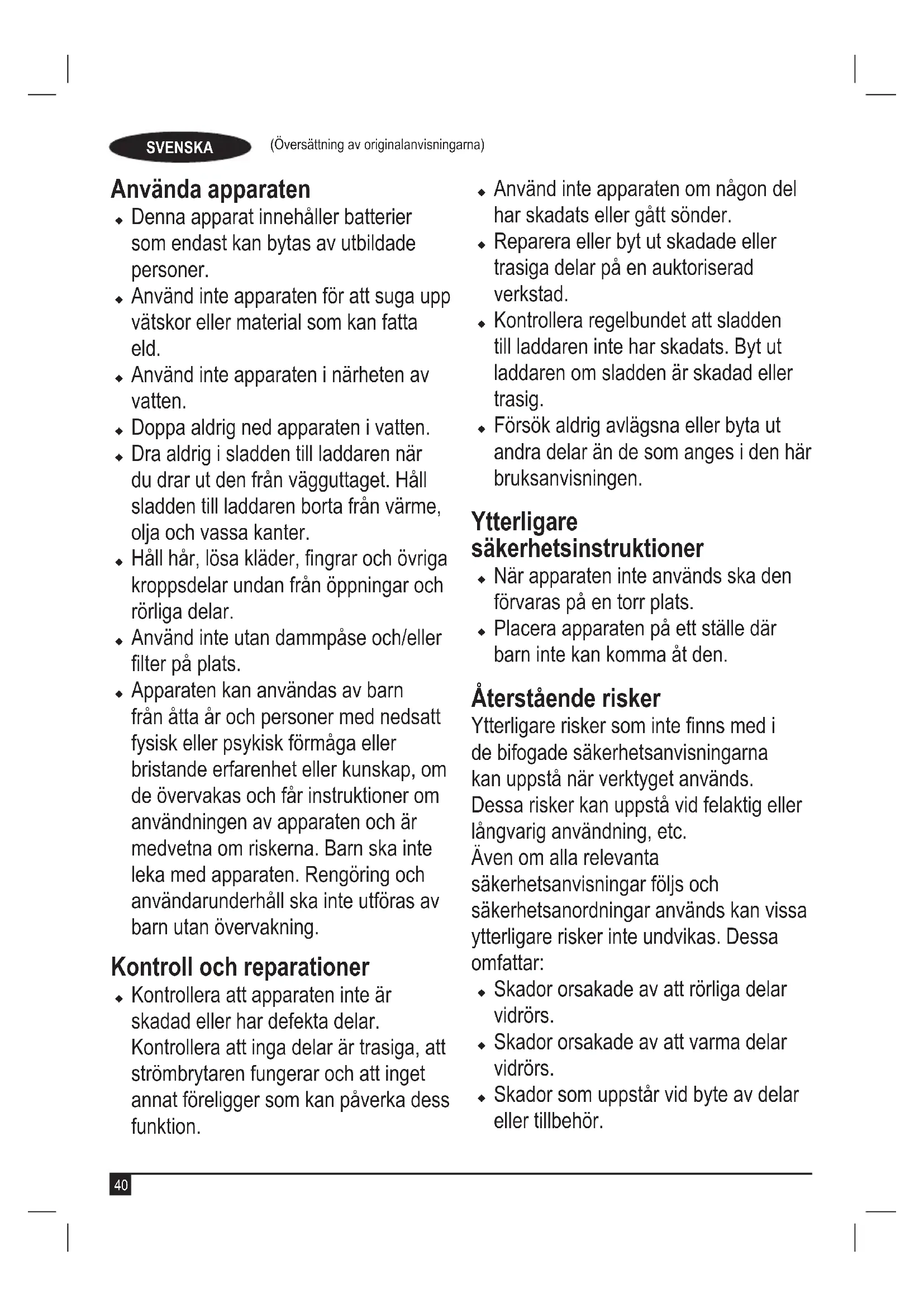 Varning! Läs alla säkerhets- varningar och instruktioner. Fel som uppstår till följd av att varningarna och instruktionerna som listas nedan inte följts kan orsaka elstötar, brand och/eller allvarliga kroppsskador. Varning! Vid användning av batteridrivna apparater ska grundläggande säkerhetsåtgärder, inklusive följande föreskrifter, alltid följas för att minska risken för brand, läckande batterier, personskador och materiella skador. u Läs h ela de n här bruksanvisningen noggrant innan du använder apparaten. u Avsedd användning beskrivs i den här bruksanvisningen. Använd inte apparaten med andra tillbehör eller tillsatser än de som rekommenderas i den här bruksanvisningen eftersom detta kan leda till personskador. u Spara den här bruksanvisningen för framtida bruk.40 (Översättning av originalanvisningarna) SVENSKA Använda apparaten u Denna apparat innehåller batterier som endast kan bytas av utbildade personer. u Använd inte apparaten för att suga upp vätskor eller material som kan fatta eld. u Använd inte apparaten i närheten av vatten. u Doppa aldrig ned apparaten i vatten. u Dra aldrig i sladden till laddaren när du drar ut den från vägguttaget. Håll sladden till laddaren borta från värme, olja och vassa kanter. u Håll hår, lösa kläder, ngrar och övriga kroppsdelar undan från öppningar och rörliga delar. u Använd inte utan dammpåse och/eller lter på plats. u Apparaten kan användas av barn från åtta år och personer med nedsatt fysisk eller psykisk förmåga eller bristande erfarenhet eller kunskap, om de övervakas och får instruktioner om användningen av apparaten och är medvetna om riskerna. Barn ska inte leka med apparaten. Rengöring och användarunderhåll ska inte utföras av barn utan övervakning. Kontroll och reparationer u Kontrollera att apparaten inte är skadad eller har defekta delar. Kontrollera att inga delar är trasiga, att strömbrytaren fungerar och att inget annat föreligger som kan påverka dess funktion. u Använd inte apparaten om någon del har skadats eller gått sönder. u Reparera eller byt ut skadade eller trasiga delar på en auktoriserad verkstad. u Kontrollera regelbundet att sladden till laddaren inte har skadats. Byt ut laddaren om sladden är skadad eller trasig. u Försök aldrig avlägsna eller byta ut andra delar än de som anges i den här bruksanvisningen. Ytterligare säkerhetsinstruktioner u När apparaten inte används ska den förvaras på en torr plats. u Placera apparaten på ett ställe där barn inte kan komma åt den. Återstående risker Ytterligare risker som inte nns med i de bifogade säkerhetsanvisningarna kan uppstå när verktyget används. Dessa risker kan uppstå vid felaktig eller långvarig användning, etc. Även om alla relevanta säkerhetsanvisningar följs och säkerhetsanordningar används kan vissa ytterligare risker inte undvikas. Dessa omfattar: u Skador orsakade av att rörliga delar vidrörs. u Skador orsakade av att varma delar vidrörs. u Skador som uppstår vid byte av delar eller tillbehör.41 (Översättning av originalanvisningarna) SVENSKA u Skador som orsakas av långvarig användning av apparaten. Se till att ta regelbundna pauser när du använder en apparat under en längre period. u Hälsorisker orsakade av inandning av damm när redskapet används (exempel: arbete med trä, särskilt ek, bok och MDF) Batteri och laddare Batterier u Försök aldrig öppna batteriet. u Utsätt inte batteriet för vatten. u Utsätt inte batteriet för värme. u Förvara inte på platser där temperaturen kan bli högre än 40 °C. u Ladda endast vid temperaturer mellan 10 °C och 40 °C. u Ladda endast med hjälp av laddaren som medföljer apparaten/verktyget. Användning av fel laddare kan resultera i en elektrisk stöt eller att batteriet överhettas. u Följ instruktionerna som anges i avsnittet ”Skydda miljön” när du kastar batterierna. u Skydda batteripaketet från skador/ deformeringar i form av slag och stötar eftersom det kan leda till personskador eller eldsvåda. u Ladda inte skadade batterier. u Under extrema förhållanden kan batterierna läcka. Om det nns vätska på batterierna ska du torka bort vätskan försiktigt med en trasa. Undvik hudkontakt. u Följ instruktionerna nedan vid kontakt med hud eller ögon. Varning! Batterivätskan kan orsaka person- eller materialskador. Vid hudkontakt, skölj genast med vatten. Vid rodnader, smärta eller irritation ska läkare uppsökas. Vid kontakt med ögon, skölj genast med rent vatten och uppsök läkare. Laddare Laddaren är avsedd för en viss spänning. Kontrollera alltid att nätspänningen överensstämmer med spänningen på typskylten och informationen i tabellen med tekniska data. Varning! Försök aldrig byta ut laddaren mot en vanlig nätkontakt. u Använd endast laddaren från BLACK+DECKER för att ladda batteriet i apparaten/verktyget som den levererades med. Andra batterier kan spricka och orsaka personskador och andra skador. u Försök aldrig ladda batterier som inte är uppladdningsbara. u Om nätsladden är skadad måste den bytas ut av tillverkaren eller en auktoriserad BLACK+DECKER- verkstad för att undvika farliga situationer. u Utsätt inte laddaren för vatten. u Öppna inte laddaren. u Gör ingen åverkan på laddaren. u Redskapet/verktyget/batteriet ska placeras på en plats med god ventilation vid laddning.42 (Översättning av originalanvisningarna) SVENSKA Elsäkerhet Laddaren är avsedd för en viss spänning. Kontrollera alltid att nätspänningen överensstämmer med spänningen på typskylten. Försök aldrig byta ut kontakten till laddaren mot en vanlig kontakt. Symboler på laddaren Läs hela den här bruksan- visningen noggrant innan du använder apparaten.