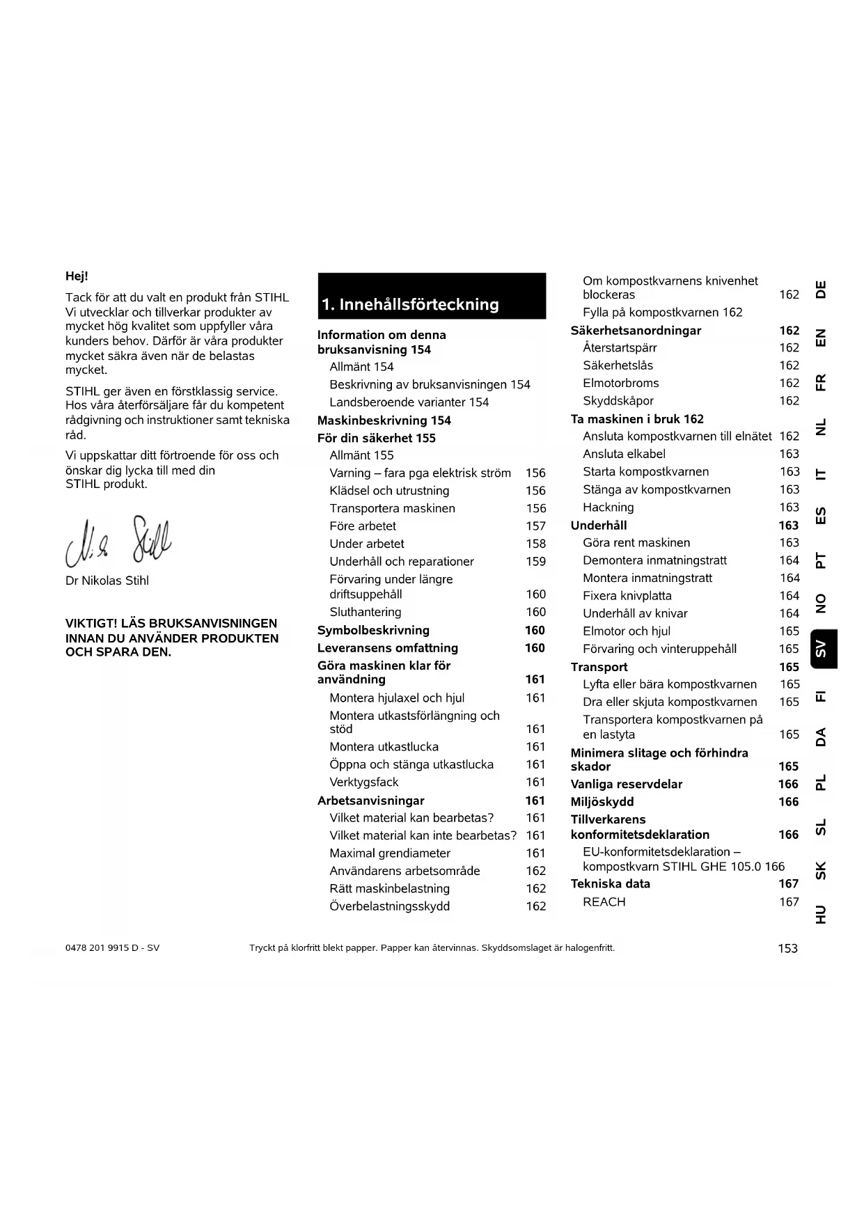 Information om denna bruksanvisning 154 Allmänt 154 Beskrivning av bruksanvisningen 154 Landsberoende varianter 154 Maskinbeskrivning 154 För din säkerhet 155 Allmänt 155 Varning – fara pga elektrisk ström 156 Klädsel och utrustning 156 Transportera maskinen 156 Före arbetet 157 Under arbetet 158 Underhåll och reparationer 159 Förvaring under längre driftsuppehåll 160 Sluthantering 160 Symbolbeskrivning 160 Leveransens omfattning 160 Göra maskinen klar för användning 161 Montera hjulaxel och hjul 161 Montera utkastsförlängning och stöd 161 Montera utkastlucka 161 Öppna och stänga utkastlucka 161 Verktygsfack 161 Arbetsanvisningar 161 Vilket material kan bearbetas? 161 Vilket material kan inte bearbetas? 161 Maximal grendiameter 161 Användarens arbetsområde 162 Rätt maskinbelastning 162 Överbelastningsskydd 162 Om kompostkvarnens knivenhet blockeras 162 Fylla på kompostkvarnen 162 Säkerhetsanordningar 162 Återstartspärr 162 Säkerhetslås 162 Elmotorbroms 162 Skyddskåpor 162 Ta maskinen i bruk 162 Ansluta kompostkvarnen till elnätet 162 Ansluta elkabel 163 Starta kompostkvarnen 163 Stänga av kompostkvarnen 163 Hackning 163 Underhåll 163 Göra rent maskinen 163 Demontera inmatningstratt 164 Montera inmatningstratt 164 Fixera knivplatta 164 Underhåll av knivar 164 Elmotor och hjul 165 Förvaring och vinteruppehåll 165 Transport 165 Lyfta eller bära kompostkvarnen 165 Dra eller skjuta kompostkvarnen 165 Transportera kompostkvarnen på en lastyta 165 Minimera slitage och förhindra skador 165 Vanliga reservdelar 166 Miljöskydd 166 Tillverkarens konformitetsdeklaration 166 EU-konformitetsdeklaration – kompostkvarn STIHL GHE 105.0 166 Tekniska data 167