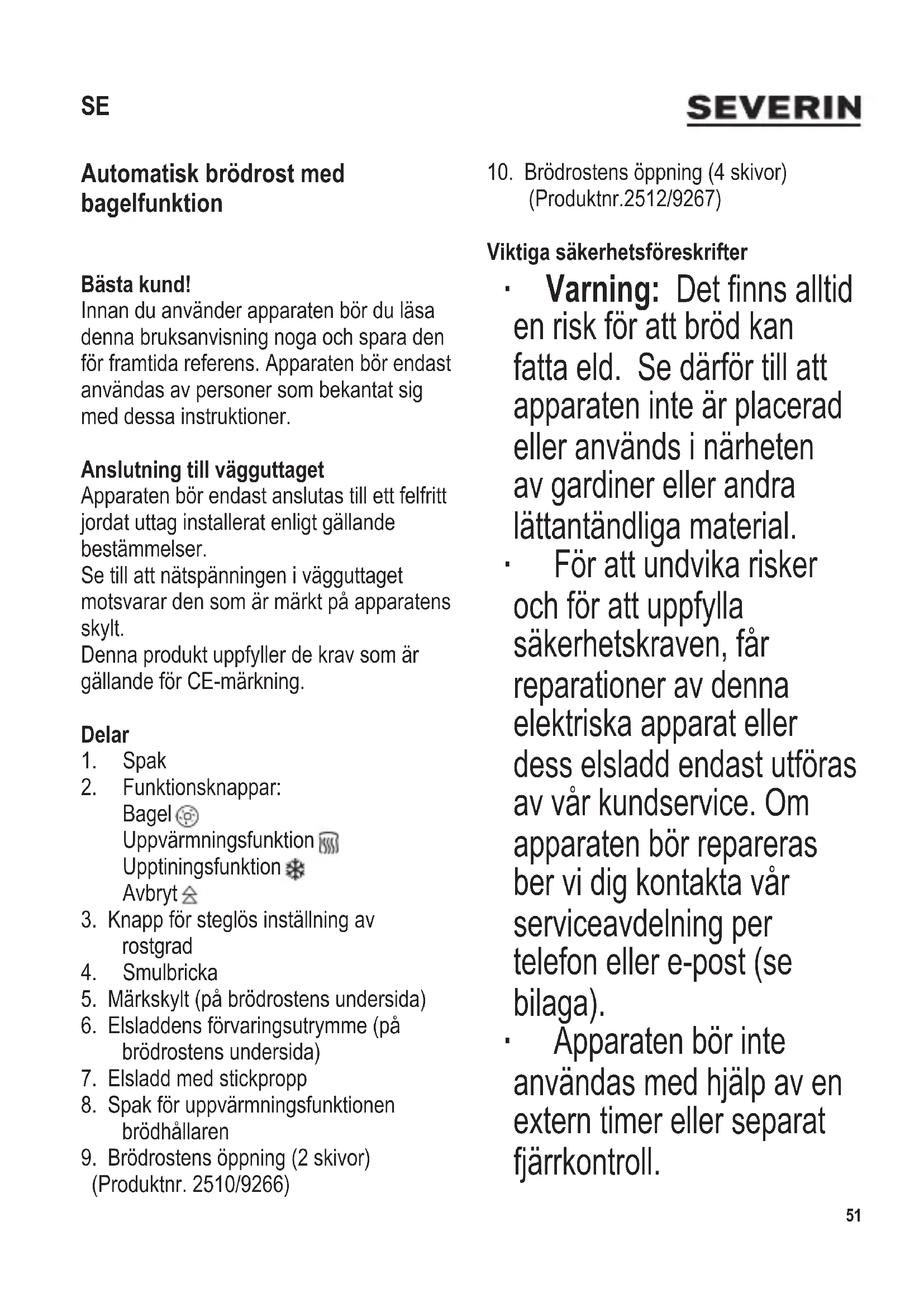 (Produktnr.2512/9267) Viktiga säkerhetsföreskrifter ∙ Varning: Det nns alltid en risk för att bröd kan fatta eld. Se därför till att apparaten inte är placerad eller används i närheten av gardiner eller andra lättantändliga material. ∙ För att undvika risker och för att uppfylla säkerhetskraven, får reparationer av denna elektriska apparat eller dess elsladd endast utföras av vår kundservice. Om apparaten bör repareras ber vi dig kontakta vår serviceavdelning per telefon eller e-post (se bilaga). ∙ Apparaten bör inte användas med hjälp av en extern timer eller separat fjärrkontroll. SE52 104 x 142 mm ∙ Se till att apparaten inte är kopplad till vägguttaget och att den har svalnat helt innan apparaten rengörs. ∙ Undvik risken för elektrisk stöt genom att inte rengöra eller doppa apparaten i vätskor. ∙ Rengör höljet genom att helt enkelt torka utsidan med en lätt fuktad duk. ∙ Då du vill tömma smulbrickan, trycker du in den kort innan du drar ut den. Töm brickan on lägg den tillbaka på sin plats. ∙ Apparaten är avsedd för hemmabruk eller liknande användning, såsom - i personalkök, kontor och andra kommersiella miljöer, - i företag inom jordbrukssektorn, - för gäster i hotell, motell och liknande inkvarteringsställen, - för gäster i bed-and- breakfast hus. ∙ Denna apparat kan användas av barn (minst 8 år gamla) och av personer som har minskad fysisk rörelseförmåga, reducerat sinnes- eller mentaltillstånd, eller som har bristfällig erfarenhet och kunskap, förutsatt att dessa personer är under uppsyn eller har fått tillräckliga instruktioner beträffande apparatens användning och vet vilka risker och säkerhetsåtgärder som användningen innefattar. ∙ Barn bör inte tillåtas leka med apparaten. ∙ Barn bör inte tillåtas rengöra eller göra service på apparaten ifall de inte är övervakade och minst 8 år gamla.104 x 142 mm