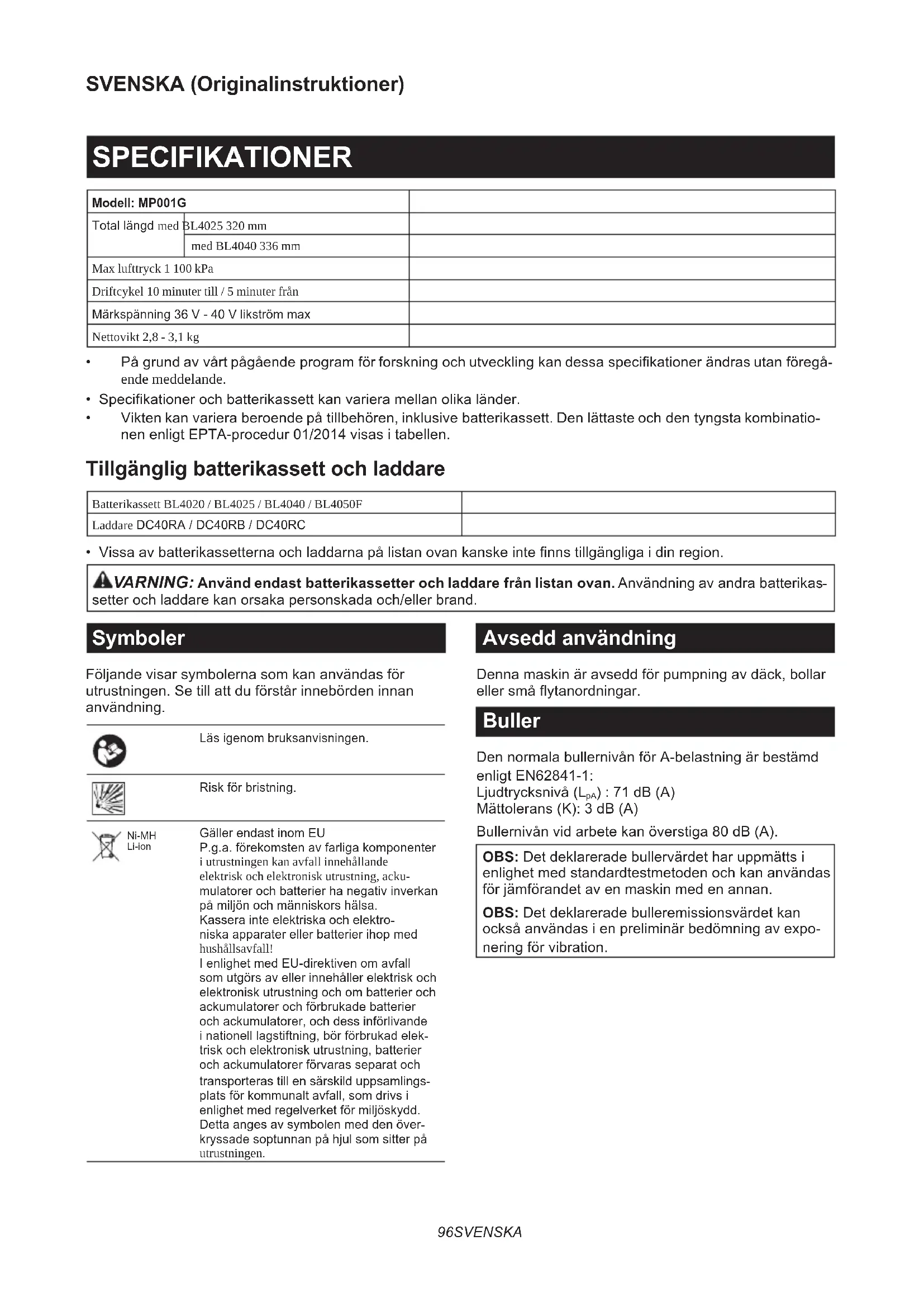 - Vissa av batterikassetterna och laddarna på listan ovan kanske inte nns tillgängliga i din region. VARNING: Använd endast batterikassetter och laddare från listan ovan. Användning av andra batterikas- setter och laddare kan orsaka personskada och/eller brand. Symboler Följande visar symbolerna som kan användas för utrustningen. Se till att du förstår innebörden innan användning. Läs igenom bruksanvisningen. Risk för bristning. Ni-MH Li-ion Gäller endast inom EU P.g.a. förekomsten av farliga komponenter i utrustningen kan avfall innehållande elektrisk och elektronisk utrustning, acku- mulatorer och batterier ha negativ inverkan på miljön och människors hälsa. Kassera inte elektriska och elektro- niska apparater eller batterier ihop med hushållsavfall! I enlighet med EU-direktiven om avfall som utgörs av eller innehåller elektrisk och elektronisk utrustning och om batterier och ackumulatorer och förbrukade batterier och ackumulatorer, och dess införlivande i nationell lagstiftning, bör förbrukad elek- trisk och elektronisk utrustning, batterier och ackumulatorer förvaras separat och transporteras till en särskild uppsamlings- plats för kommunalt avfall, som drivs i enlighet med regelverket för miljöskydd. Detta anges av symbolen med den över- kryssade soptunnan på hjul som sitter på utrustningen. Avsedd användning Denna maskin är avsedd för pumpning av däck, bollar eller små ytanordningar. Buller Den normala bullernivån för A-belastning är bestämd enligt EN62841-1: Ljudtrycksnivå (L