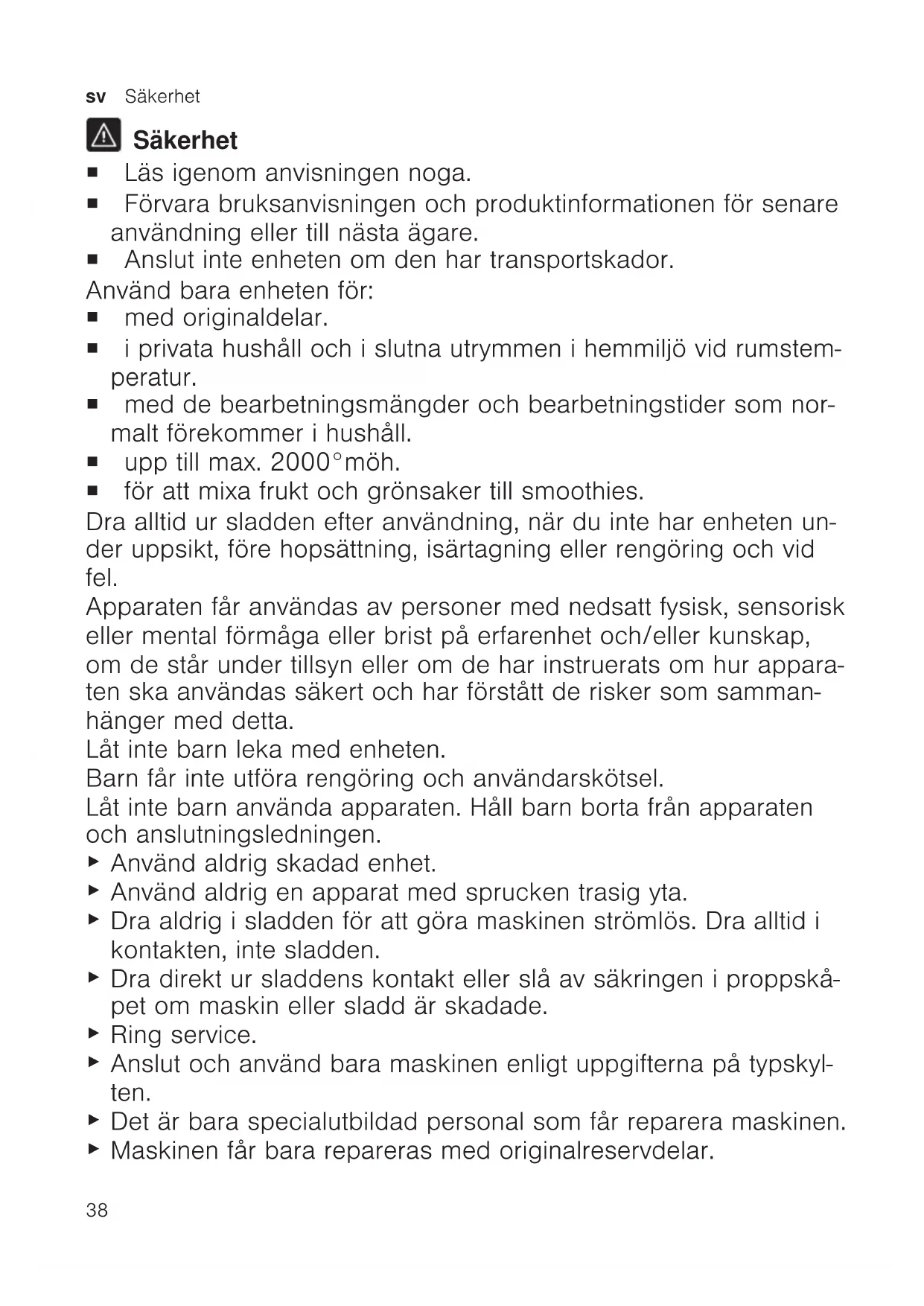 Säkerhet ¡ Läs igenom anvisningen noga. ¡ Förvara bruksanvisningen och produktinformationen för senare användning eller till nästa ägare. ¡ Anslut inte enheten om den har transportskador. Använd bara enheten för: ¡ med originaldelar. ¡ i privata hushåll och i slutna utrymmen i hemmiljö vid rumstem- peratur. ¡ med de bearbetningsmängder och bearbetningstider som nor- malt förekommer i hushåll. ¡ upp till max. 2000°möh. ¡ för att mixa frukt och grönsaker till smoothies. Dra alltid ur sladden efter användning, när du inte har enheten un- der uppsikt, före hopsättning, isärtagning eller rengöring och vid fel. Apparaten får användas av personer med nedsatt fysisk, sensorisk eller mental förmåga eller brist på erfarenhet och/eller kunskap, om de står under tillsyn eller om de har instruerats om hur appara- ten ska användas säkert och har förstått de risker som samman- hänger med detta. Låt inte barn leka med enheten. Barn får inte utföra rengöring och användarskötsel. Låt inte barn använda apparaten. Håll barn borta från apparaten och anslutningsledningen.