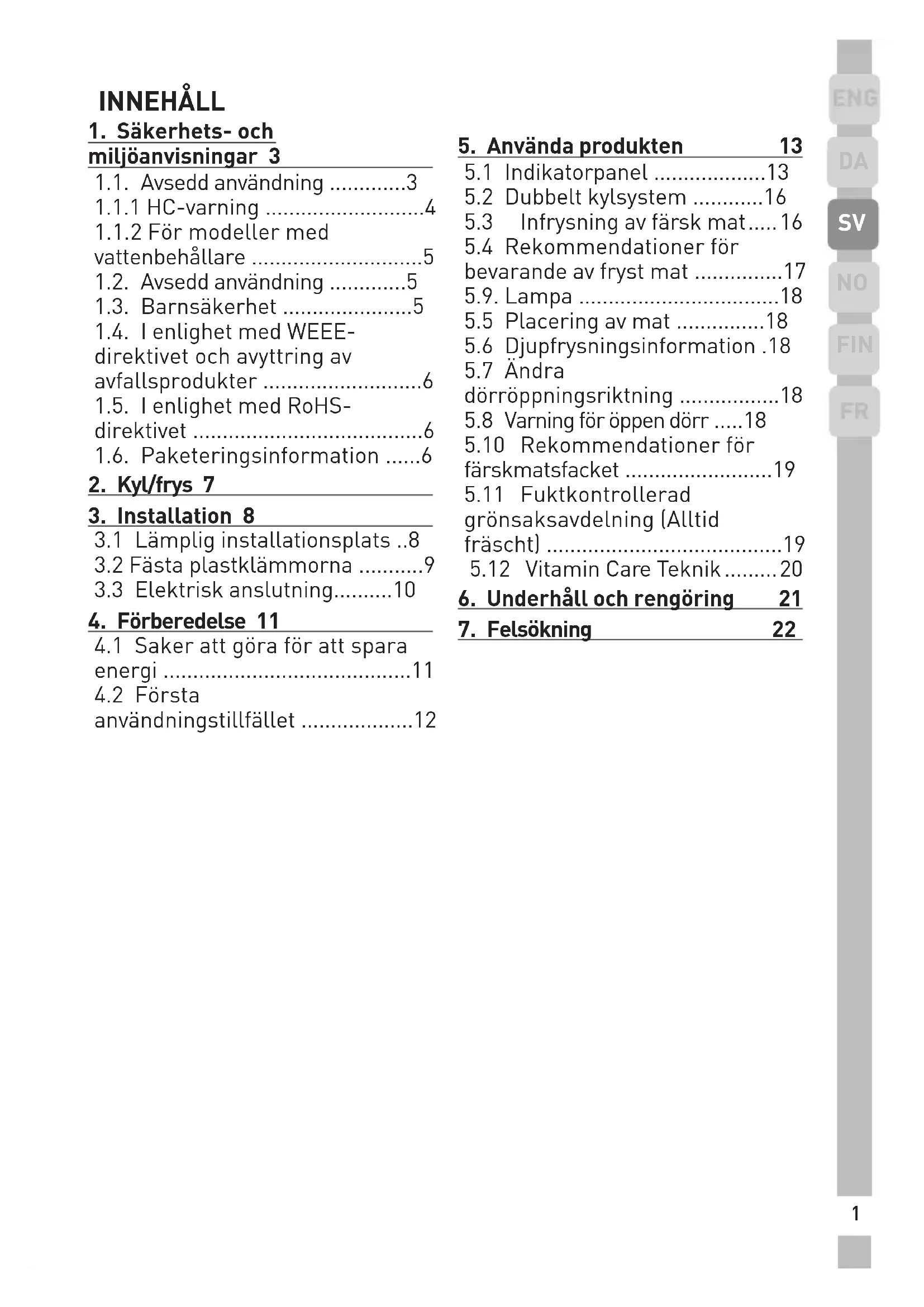 VARNING: Använd inte elektriska apparater inuti matvaruförvaringsutrymmena i apparaten, såvida de inte är av den typ som rekommenderas av tillverkaren. Denna apparat är avsedd att användas i hushåll och liknande användning såsom - personalkök i butiker, kontor och andra arbetsmiljöer; - Bondgårdar och av kunder på hotell, motell och andra bostadsmiljöer; - Bed and breakfast-miljöer; - Catering och liknande icke- detaljhandelsanvändning. Allmän säkerhet
