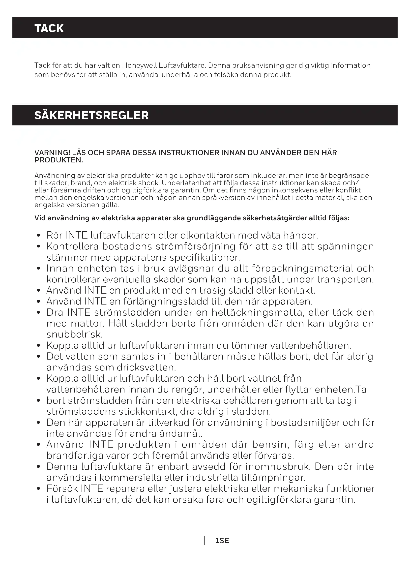 Acqua sul pavimento Il tubo di scarico potrebbe essere allentato. Verificare il collegamento tra il tubo e il bocchettone di scarico dell'unità. Consultare la sezione Scarico dell'acqua continuo. Il serbatoio ha raccolto l'acqua ma il tubo di scarico continuo è sempre collegato. Scollegare il tubo se si utilizza il serbatoio per raccogliere l'acqua. Consultare la sezione sullo scarico dell'acqua continuo. Rumore La ventola funziona. La ventilazione proveniente dalla ventola può creare rumori durante il funzionamento, il che è del tutto normale.1SE TACK SÄKERHETSREGLER Tack för att du har valt en Honeywell Luftavfuktare. Denna bruksanvisning ger dig viktig information som behövs för att ställa in, använda, underhålla och felsöka denna produkt. VARNING! LÄS OCH SPARA DESSA INSTRUKTIONER INNAN DU ANVÄNDER DEN HÄR PRODUKTEN. Användning av elektriska produkter kan ge upphov till faror som inkluderar, men inte är begränsade till skador, brand, och elektrisk shock. Underlåtenhet att följa dessa instruktioner kan skada och/ eller försämra driften och ogiltigförklara garantin. Om det finns någon inkonsekvens eller konflikt mellan den engelska versionen och någon annan språkversion av innehållet i detta material, ska den engelska versionen gälla. Vid användning av elektriska apparater ska grundläggande säkerhetsåtgärder alltid följas: Rör INTE luftavfuktaren eller elkontakten med våta händer. Kontrollera bostadens strömförsörjning för att se till att spänningen stämmer med apparatens specifikationer. Innan enheten tas i bruk avlägsnar du allt förpackningsmaterial och kontrollerar eventuella skador som kan ha uppstått under transporten. Använd INTE en produkt med en trasig sladd eller kontakt. Använd INTE en förlängningssladd till den här apparaten. Dra INTE strömsladden under en heltäckningsmatta, eller täck den med mattor. Håll sladden borta från områden där den kan utgöra en snubbelrisk. Koppla alltid ur luftavfuktaren innan du tömmer vattenbehållaren. Det vatten som samlas in i behållaren måste hällas bort, det får aldrig användas som dricksvatten. Koppla alltid ur luftavfuktaren och häll bort vattnet från vattenbehållaren innan du rengör, underhåller eller flyttar enheten.Ta bort strömsladden från den elektriska behållaren genom att ta tag i strömsladdens stickkontakt, dra aldrig i sladden. Den här apparaten är tillverkad för användning i bostadsmiljöer och får inte användas för andra ändamål. Använd INTE produkten i områden där bensin, färg eller andra brandfarliga varor och föremål används eller förvaras. Denna luftavfuktare är enbart avsedd för inomhusbruk. Den bör inte användas i kommersiella eller industriella tillämpningar. Försök INTE reparera eller justera elektriska eller mekaniska funktioner i luftavfuktaren, då det kan orsaka fara och ogiltigförklara garantin.