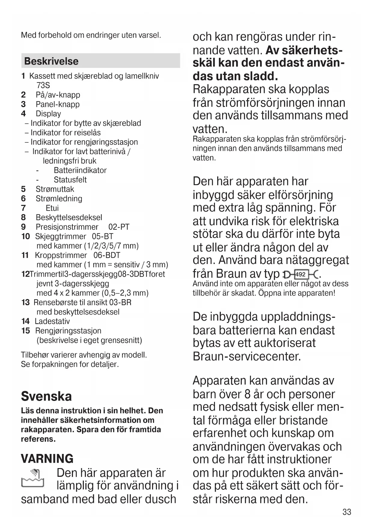 Använd inte om apparaten eller något av dess tillbehör är skadat. Öppna inte apparaten! De inbyggda uppladdnings- bara batterierna kan endast bytas av ett auktoriserat Braun-servicecenter. Apparaten kan användas av barn över 8 år och personer med nedsatt fysisk eller men- tal förmåga eller bristande erfarenhet och kunskap om användningen övervakas och om de har fått instruktioner om hur produkten ska använ- das på ett säkert sätt och för- står riskerna med den. 90081363_UI_S7_Shaver+Attachments_EURO+KOREA.indd 3390081363_UI_S7_Shaver+Attachments_EURO+KOREA.indd 33 05.11.21 11:0305.11.21 11:0334 Om ett hårklippningstillbehör medföljer apparaten kan det användas för hårklippningsän- damål av barn från 3 år under övervakning. Barn ska inte leka med pro- dukten. Rengöring och under- håll ska inte utföras av barn. Uppmärksamhet Rekommenderad omgivningstemperatur för laddning är 5 °C - 35 °C, för lagring och rak- ning är det 15 °C till 35° C. Rakapparaten får inte utsättas för temperatu- rer över 50°C under en längre tid. Borsten (03-BR) ska ej användas på skadad eller irriterad hud eller på sår. Om hudirritation uppstår, avbryt användningen. Undvik direkt kontakt med ögon och hårfäste. Kroppstrimmern (06-BDT) ska endast använ- das med kamtillbehör på känsliga områden. Använd bara apparaten för dess tänkta syfte. Av hygieniska skäl ska du inte dela apparaten med andra. Så här kommer du igång Första gången du ska aktivera apparaten ansluter du den till ett eluttag. Koppla sedan från den vid användning. Så här rakar du dig Håll rakhuvudet i rät vinkel (90°) mot huden du ska raka, så att alla skärelement har hudkontakt. Raka fram och tillbaka, i samma riktning som skäggväxten. Så här rengör du apparaten Kassetten med skärblad och lamellknivar måste rengöras under hett rinnande vatten efter varje användning med skum eller gel! Borsten (03-BR) måste rengöras med kallt rin- nande vatten efter varje användning! Sätt på rakapparaten och skölj tills alla rester är borta. När kassetten med skärblad och lamellknivar har satts tillbaka igen så kan den rengöras i rengöringsstationen. Produkten innehåller batterier och/ eller återvinningsbart elavfall. Av hänsyn till miljön ska denna apparat inte slängas med hushållsavfallet. Återvinning bör ske enligt gällande lokala föreskrifter. Med förbehåll för ändringar utan föregående meddelande. Beskrivning 1 Skärblads- och saxkassett 73S 2 På/av-knapp 3 Panelknapp 4 Display - Indikator för byte av skärblad - Reselåsindikator - Indikator för rengöringsstation - Indikator för dåligt batteri/indikator för sladdlös användning - Batteriindikator - Statusfält 5 Stickkontakt 6 Strömsladd 7 Fodral 8 Skyddskåpa 9 Precisionstrimmer 02-PT 10 Skäggtrimmer 05-BT med kammar (1/2/3/5/7 mm) 11 Kroppstrimmer 06-BDT med kammar (1 mm=känslig/3 mm) 12 Skäggtrimmer för tredagarsskägg 08-3DBT för en look med tredagarsskägg med 4 x 2 kammar (0,5–2,3 mm) 13 Ansiktsrengöringsborste 03-BR med skyddskåpa 14 Laddningsställ 15 Rengöringsstation (beskrivning i separat UI) Tillbehören varierar beroende på modell. Se förpackningen för mer information. 90081363_UI_S7_Shaver+Attachments_EURO+KOREA.indd 3490081363_UI_S7_Shaver+Attachments_EURO+KOREA.indd 34 05.11.21 11:0305.11.21 11:0335 Suomi Lue nämä laitteen turvallisuustietoja sisältävät ohjeet huolellisesti. Säilytä ohjeet myöhempää tarvetta varten. VAROITUS Laite soveltuu puhdis- tettavaksi juoksevalla vedellä ja suihkussa. Turvalli- suussyistä sitä voidaan käyt- tää vain ilman verkkojohtoa. Irrota parranajokone virtaläh- teestä ennen sen puhdista- mista vedellä. Pidä virtajohto, latausteline ja puhdistus- asema kuivina. Laite on varustettu erillisellä pienoisjännitemuuntajalla. Sähköiskun vaaran välttämi- seksi älä vaihda siihen mitään osia tai tee mitään muutoksia. Käytä ainoastaan Braun-virta- lähteen kanssa, jossa on mer- kintä