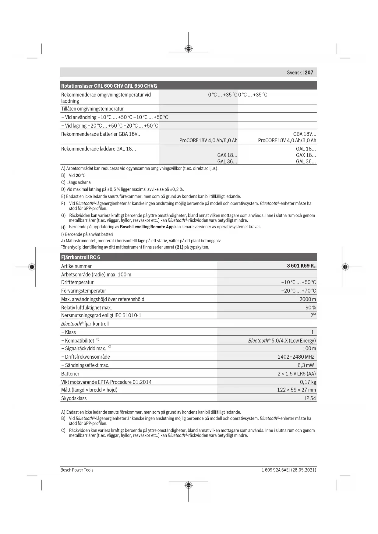 I bruksanvisningen avbildat och beskrivet tillbehör ingår inte i standardleveransen. I vårt tillbehörsprogram beskrivs allt tillbehör som finns. Bosch Power Tools 1 609 92A 6AE | (28.05.2021)206 | Svensk Tekniska data Rotationslaser GRL 600 CHV GRL 650 CHVG Artikelnummer 3601K61F.. 3601K61V.. Arbetsområde (radie) – Utan lasermottagare max.