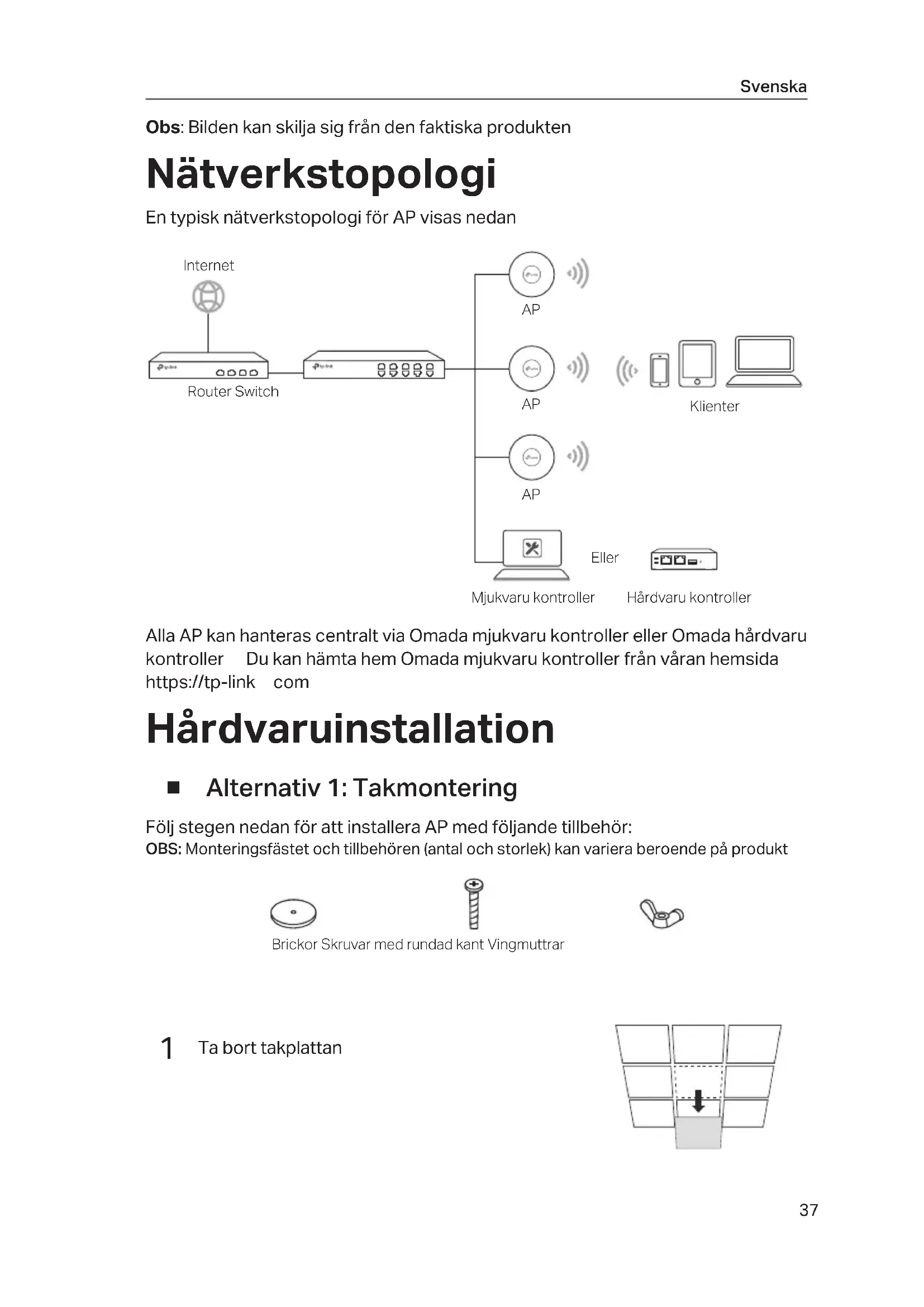 PoE LAN PoE AdapterSwitch37 Svenska Obs: Bilden kan skilja sig från den faktiska produkten Nätverkstopologi En typisk nätverkstopologi för AP visas nedan Alla AP kan hanteras centralt via Omada mjukvaru kontroller eller Omada hårdvaru kontroller Du kan hämta hem Omada mjukvaru kontroller från våran hemsida https://tp-linkcom Hårdvaruinstallation ■ Alternativ 1: Takmontering Följ stegen nedan för att installera AP med följande tillbehör: OBS: Monteringsfästet och tillbehören (antal och storlek) kan variera beroende på produktBrickor Skruvar med rundad kant Vingmuttrar