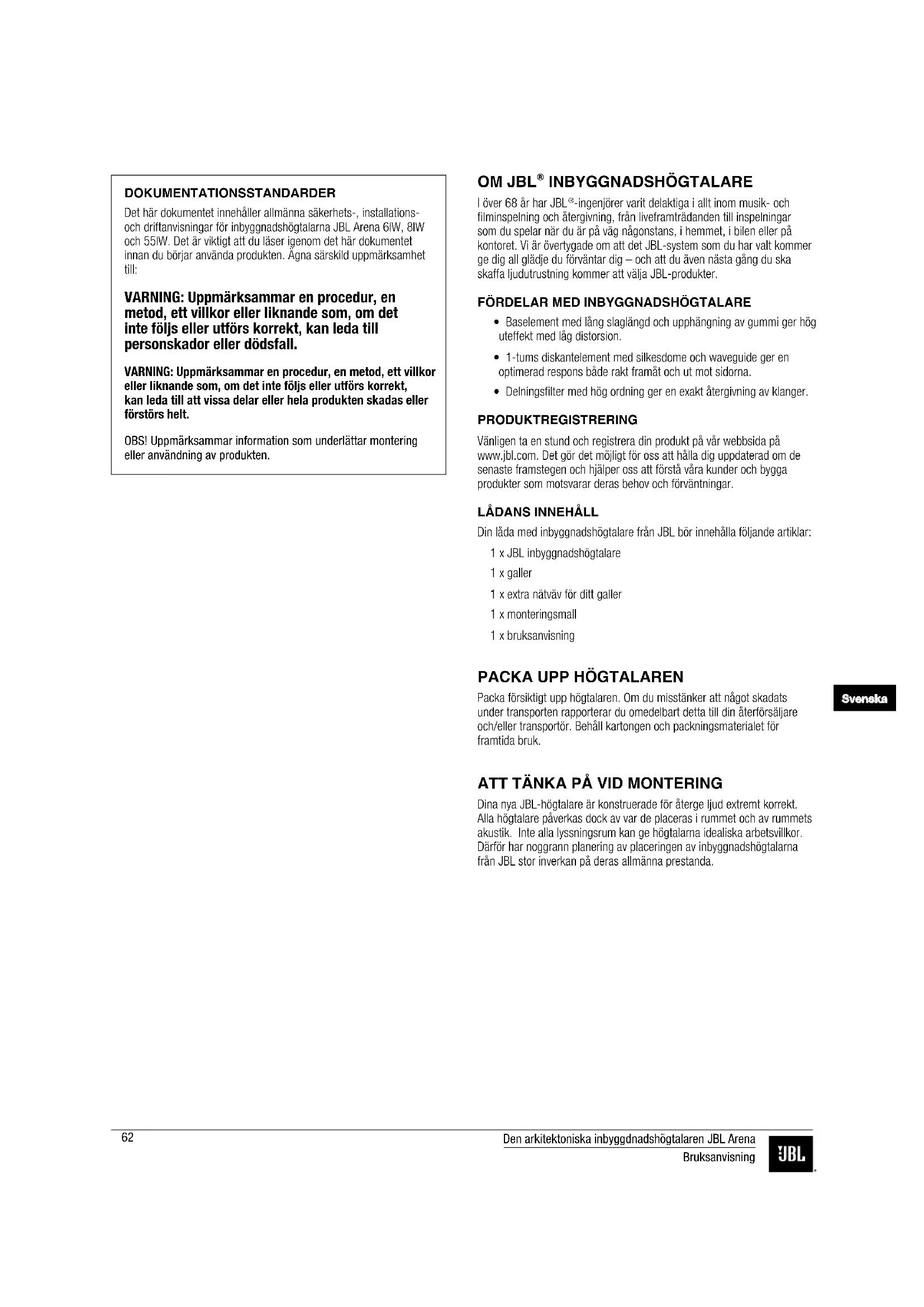 Dina nya JBL-högtalare är konstruerade för återge ljud extremt korrekt. Alla högtalare påverkas dock av var de placeras i rummet och av rummets akustik. Inte alla lyssningsrum kan ge högtalarna idealiska arbetsvillkor. Därför har noggrann planering av placeringen av inbyggnadshögtalarna från JBL stor inverkan på deras allmänna prestanda. DOKUMENTATIONSSTANDARDER Det här dokumentet innehåller allmänna säkerhets-, installations- och driftanvisningar för inbyggnadshögtalarna JBL Arena 6IW, 8IW och 55IW. Det är viktigt att du läser igenom det här dokumentet innan du börjar använda produkten. Ägna särskild uppmärksamhet till: VARNING: Uppmärksammar en procedur, en metod, ett villkor eller liknande som, om det inte följs eller utförs korrekt, kan leda till personskador eller dödsfall. VARNING: Uppmärksammar en procedur, en metod, ett villkor eller liknande som, om det inte följs eller utförs korrekt, kan leda till att vissa delar eller hela produkten skadas eller förstörs helt. OBS! Uppmärksammar information som underlättar montering eller användning av produkten.63 Den arkitektoniska inbyggdnadshögtalaren JBL Arena Bruksanvisning English Français Español Português do Brasil Deutsch Italiano Nederlands Norsk Suomi