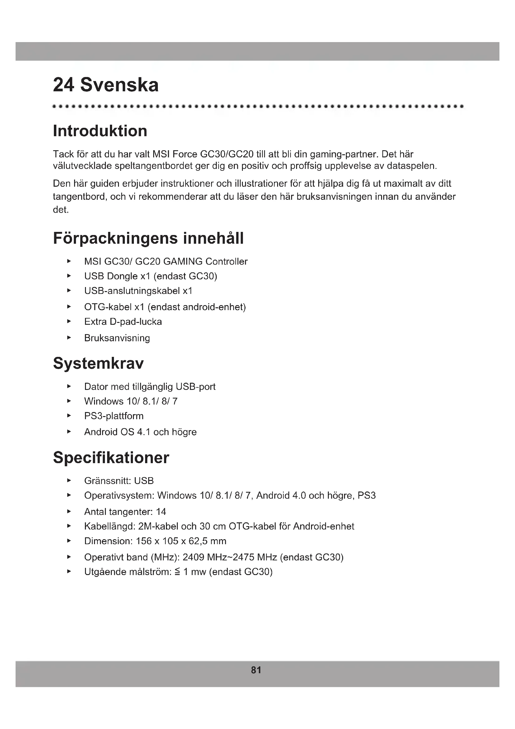 - Pozvolenítohtorežimusvieti3.a4.indikátoryLEDrežimu.81 24 Svenska Introduktion TackförattduharvaltMSIForceGC30/GC20tillattblidingaming-partner.Dethär välutvecklade speltangentbordet ger dig en positiv och proffsig upplevelse av dataspelen. Denhärguidenerbjuderinstruktionerochillustrationerföratthjälpadigfåutmaximaltavditt tangentbord, och vi rekommenderar att du läser den här bruksanvisningen innan du använder det. Förpackningens innehåll ▶ MSI GC30/ GC20 GAMING Controller ▶ USB Dongle x1 (endast GC30) ▶ USB-anslutningskabel x1 ▶ OTG-kabel x1 (endast android-enhet) ▶ Extra D-pad-lucka ▶ Bruksanvisning Systemkrav ▶ Dator med tillgänglig USB-port ▶ Windows 10/ 8.1/ 8/ 7 ▶ PS3-plattform ▶ AndroidOS4.1ochhögre Specifikationer ▶ Gränssnitt: USB ▶ Operativsystem:Windows10/8.1/8/7,Android4.0ochhögre,PS3 ▶ Antal tangenter: 14 ▶ Kabellängd:2M-kabeloch30cmOTG-kabelförAndroid-enhet ▶ Dimension: 156 x 105 x 62,5 mm ▶ Operativt band (MHz): 2409 MHz~2475 MHz (endast GC30) ▶ Utgåendemålström:≦1mw(endastGC30)82 Översikt