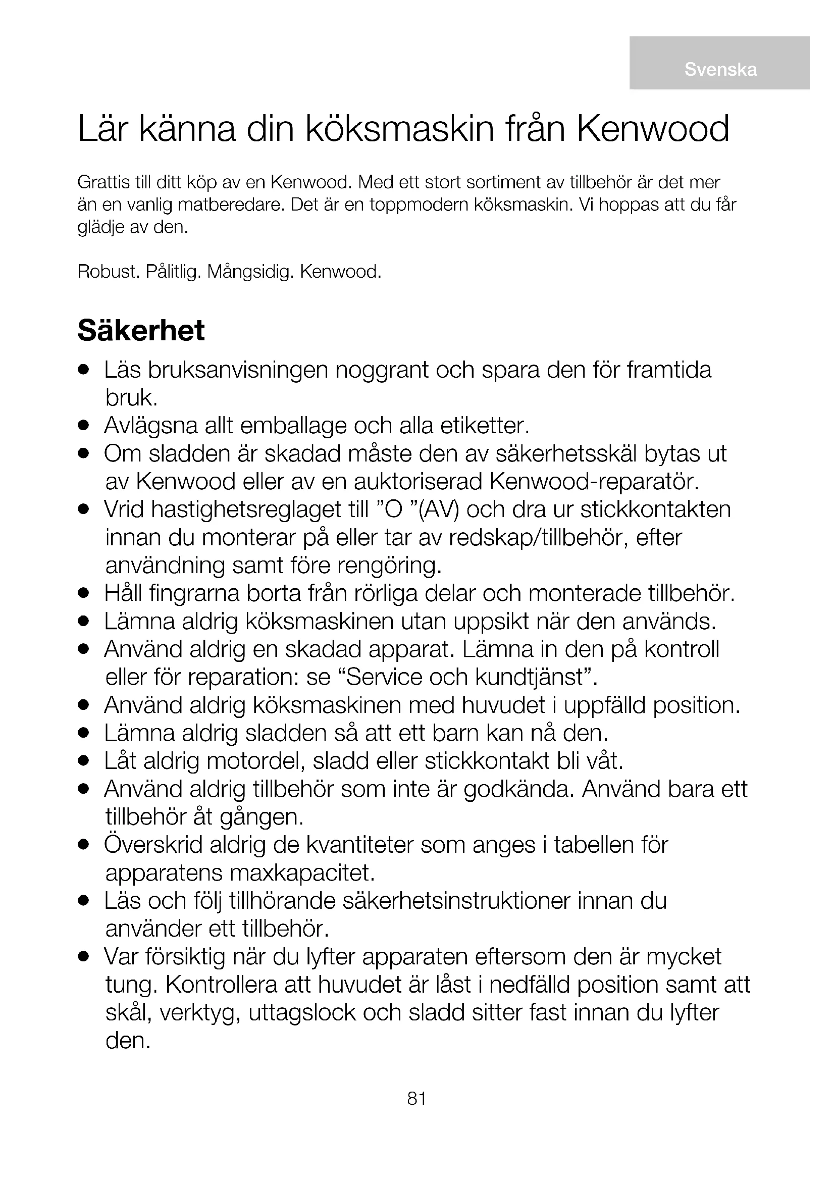 (WEEE) Ved afslutningen af dets produktive liv må produktet ikke bortskaffes som almindeligt affald. Det bør afleveres på et specialiseret lokalt genbrugscenter eller til en forhandler, der yder denne service. At bortskaffe et elektrisk husholdningsapparat separat gør det muligt at undgå eventuelle negative konsekvenser for miljø og helbred på grund af uhensigtsmæssig bortskaffelse, og det giver mulighed for at genbruge de materialer det består af, og dermed opnå en betydelig energi- og ressourcebesparelse. Som en påmindelse om nødvendigheden af at bortskaffe elektriske husholdningsapparater separat, er produktet mærket med en mobil affaldsbeholder med et kryds.81 Lär känna din köksmaskin från Kenwood Grattis till ditt köp av en Kenwood. Med ett stort sortiment av tillbehör är det mer än en vanlig matberedare. Det är en toppmodern köksmaskin. Vi hoppas att du får glädje av den. Robust. Pålitlig. Mångsidig. Kenwood. Svenska Säkerhet