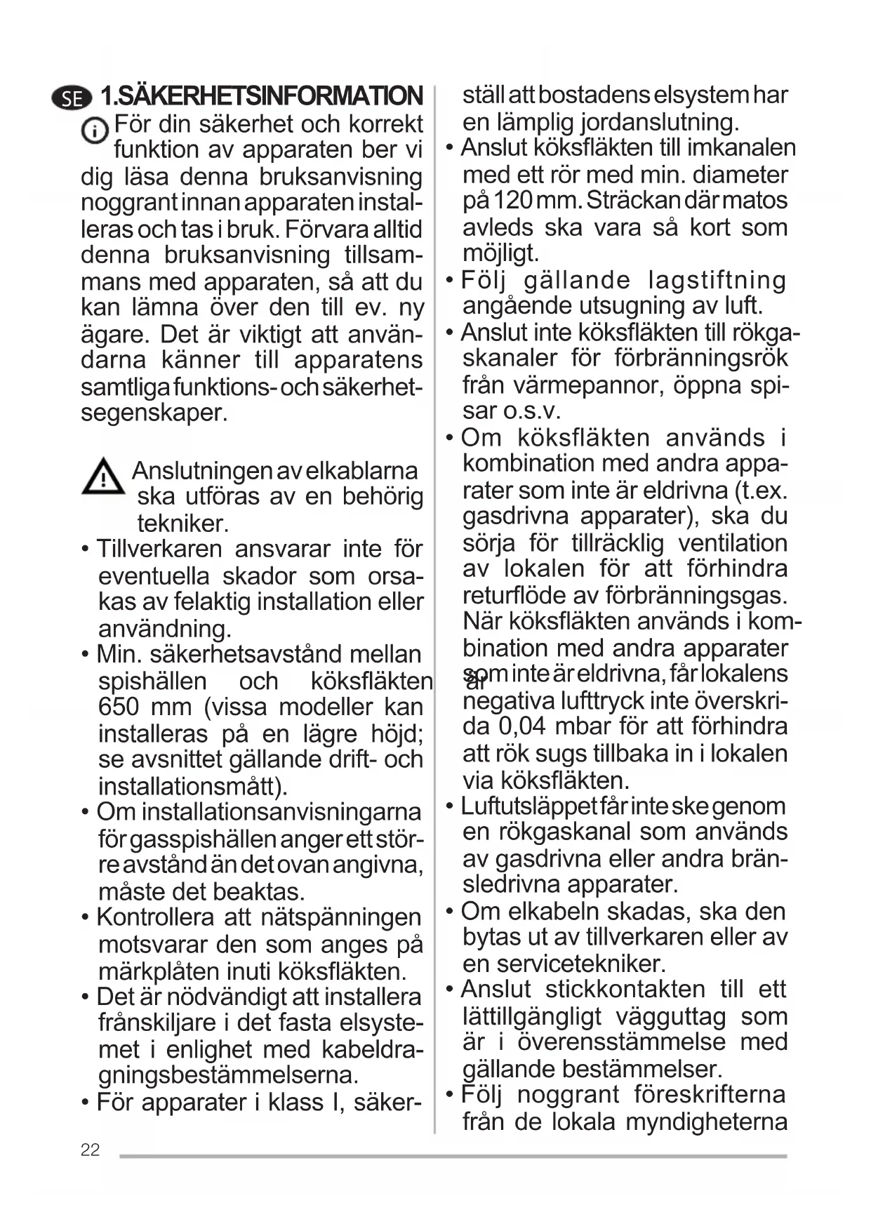 - Neem voor de vervanging contact op met de klantenservice (‘Wend u voor de aankoop tot de klantenservice’).22 1.SÄKERHETSINFORMATION För din säkerhet och korrekt funktion av apparaten ber vi dig läsa denna bruksanvisning noggrant innan apparaten instal- leras och tas i bruk. Förvara alltid denna bruksanvisning tillsam- mans med apparaten, så att du kan lämna över den till ev. ny ägare. Det är viktigt att använ- darna känner till apparatens samtliga funktions- och säkerhet- segenskaper. Anslutningen av elkablarna ska utföras av en behörig tekniker.