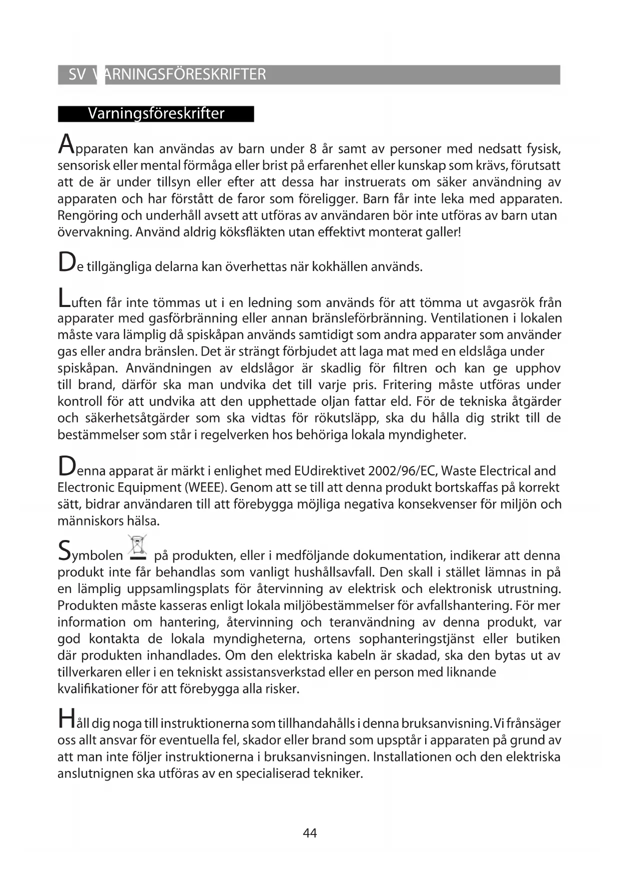 Apparaten kan användas av barn under 8 år samt av personer med nedsatt fysisk, sensorisk eller mental förmåga eller brist på erfarenhet eller kunskap som krävs, förutsatt att de är under tillsyn eller efter att dessa har instruerats om säker användning av apparaten och har förstått de faror som föreligger. Barn får inte leka med apparaten. Rengöring och underhåll avsett att utföras av användaren bör inte utföras av barn utan övervakning. Använd aldrig köksäkten utan eektivt monterat galler! De tillgängliga delarna kan överhettas när kokhällen används. Luften får inte tömmas ut i en ledning som används för att tömma ut avgasrök från apparater med gasförbränning eller annan bränsleförbränning. Ventilationen i lokalen måste vara lämplig då spiskåpan används samtidigt som andra apparater som använder gas eller andra bränslen. Det är strängt förbjudet att laga mat med en eldslåga under spiskåpan. Användningen av eldslågor är skadlig för ltren och kan ge upphov till brand, därför ska man undvika det till varje pris. Fritering måste utföras under kontroll för att undvika att den upphettade oljan fattar eld. För de tekniska åtgärder och säkerhetsåtgärder som ska vidtas för rökutsläpp, ska du hålla dig strikt till de bestämmelser som står i regelverken hos behöriga lokala myndigheter. Denna apparat är märkt i enlighet med EUdirektivet 2002/96/EC, Waste Electrical and Electronic Equipment (WEEE). Genom att se till att denna produkt bortskaas på korrekt sätt, bidrar användaren till att förebygga möjliga negativa konsekvenser för miljön och människors hälsa. Symbolen på produkten, eller i medföljande dokumentation, indikerar att denna produkt inte får behandlas som vanligt hushållsavfall. Den skall i stället lämnas in på en lämplig uppsamlingsplats för återvinning av elektrisk och elektronisk utrustning. Produkten måste kasseras enligt lokala miljöbestämmelser för avfallshantering. För mer information om hantering, återvinning och teranvändning av denna produkt, var god kontakta de lokala myndigheterna, ortens sophanteringstjänst eller butiken där produkten inhandlades. Om den elektriska kabeln är skadad, ska den bytas ut av tillverkaren eller i en tekniskt assistansverkstad eller en person med liknande kvalikationer för att förebygga alla risker. Håll dig noga till instruktionerna som tillhandahålls i denna bruksanvisning. Vi frånsäger oss allt ansvar för eventuella fel, skador eller brand som upsptår i apparaten på grund av att man inte följer instruktionerna i bruksanvisningen. Installationen och den elektriska anslutnignen ska utföras av en specialiserad tekniker.45