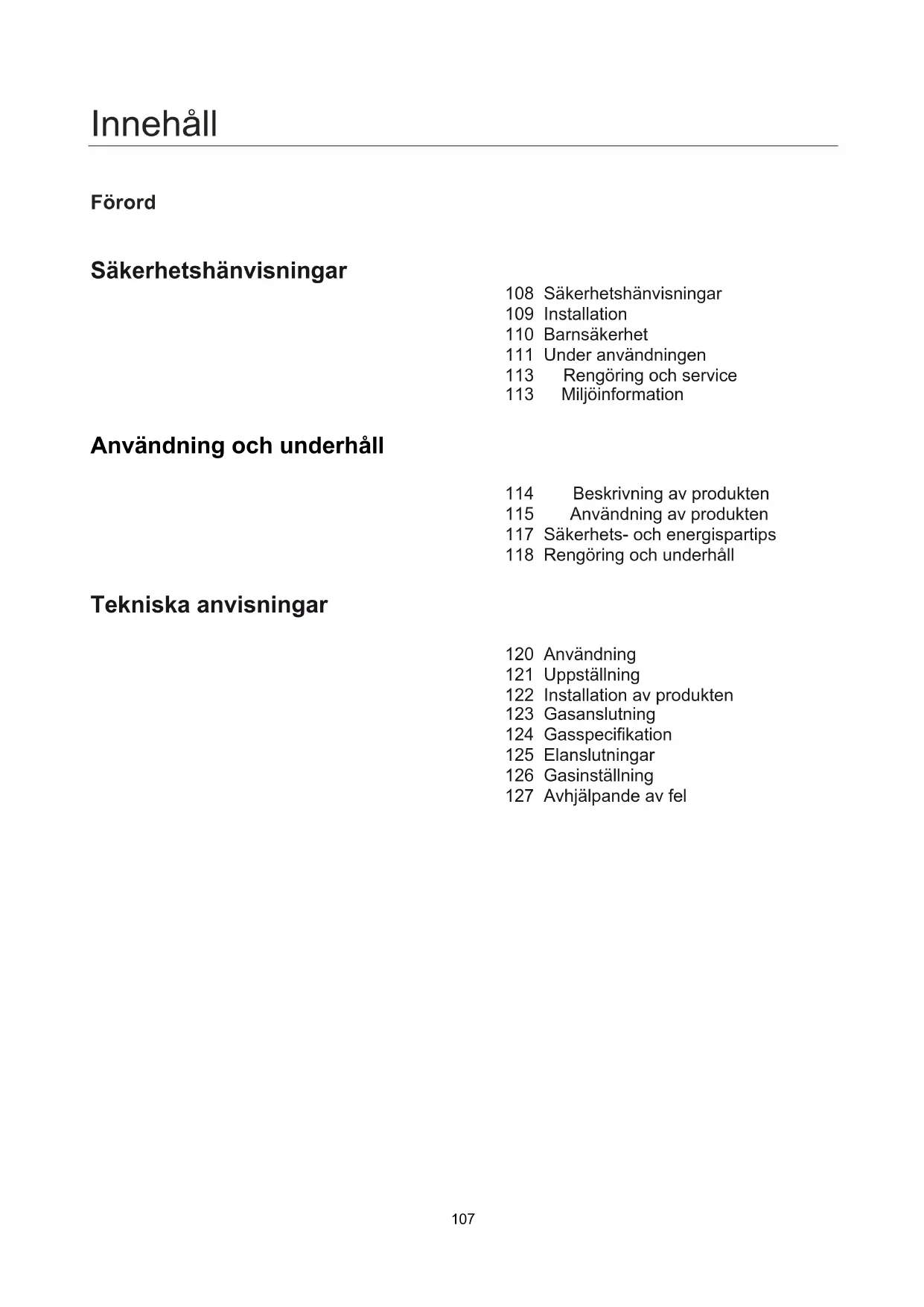 ■ Se il problema non è risolvibile, rivolgersi all’assistenza clienti.107 Innehåll Förord Säkerhetshänvisningar 108 Säkerhetshänvisningar 109 Installation 110 Barnsäkerhet 111 Under användningen 113 Rengöring och service 113 Miljöinformation Användning och underhåll 114 Beskrivning av produkten 115 Användning av produkten 117 Säkerhets- och energispartips 118 Rengöring och underhåll Tekniska anvisningar 120 Användning 121 Uppställning 122 Installation av produkten 123 Gasanslutning 124 Gasspecifikation 125 Elanslutningar 126 Gasinställning 127 Avhjälpande av fel108 Säkerhetshänvisningar ■ Ta dig tid att läsa igenom denna bruksanvisning innan du installerar eller använder produkten. ■ Spara bruksanvisningen för framtida bruk. Om produkten säljs eller lämnas till någon annan måste även denna bruksanvisning lämnas med. ■ Vid underlåtenhet att beakta dessa säkerhetsåtgärder frånsäger sig tillverkaren allt ansvar. ■ Följande hänvisningar är utformade så att de är lättfattliga, detta för att undvika olycksfall p.g.a. felaktig användning och för att produkten skall kunna användas på ett bekvämt sätt. ■ Läs igenom följande kapitel noggrant.
