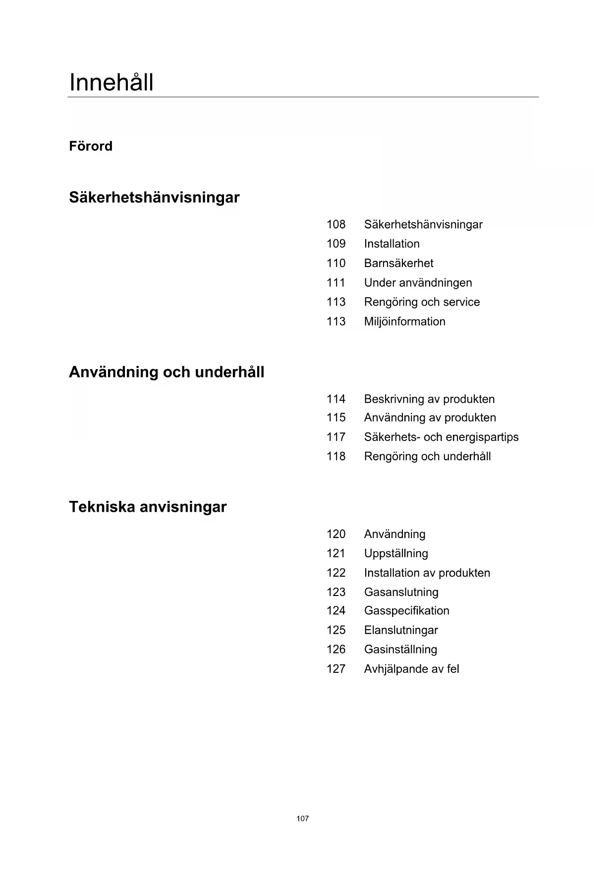 LPG110 Barnsäkerhet Varning OBS ■ Denna produkt är avsedd att användas av vuxna personer. ■ Barn kan skadas om de drar av pannor eller grytor från produkten. ■ Denna produkt får inte användas av barn eller andra personer vilkas fysiska, sensoriska eller mentala förmåga eller bristande erfarenheter och kunskaper hindrar dem från att använda produkten på ett säkert sätt utan överinseende eller anvisning genom en ansvarig person. Låt inte barnen leka i närheten av produkten. Produkten blir het när den är igång. Håll barnen borta tills att produkten har svalnat.111 Under användningen Varning ■ Använd produkten endast för tillagning av livsmedel. ■ Gör inga förändringar av produkten. Brännarområdet är inte avsett för drift med extern timer eller separat fjärrkontrollsystem. ■ När en gasspis används, genereras värme och fukt i det rum där produkten är installerad. Se till att ha god ventilation i köket: Håll ventilationshålen öppna eller installera en mekanisk ventilationsanordning (mekanisk fläktkåpa). ■ Använd inte produkten om den kommer i kontakt med vatten. Använd inte produkten med våta händer. ■ Under användning blir produktens värme- och matlagningsytor heta. Var mycket försiktig. ■ Använd inga stora dukar, diskhanddukar eller liknande; ändarna kan vidröra lågorna, och en brand kan uppstå. ■ Lämna aldrig produkten utan uppsikt under matlagningen. ■ Använd inga instabila eller deformerade pannor; de kan tippa eller tömmas oavsiktligt.112 Under användningen ■ I närheten av produkten får inga antändliga material användas eller förvaras. ■ Känsliga livsmedel, plastartiklar och aerosoler kan påverkas av värmeeffekten och bör inte förvaras ovanför eller under produkten. ■ Under drift får inga aerosoler sprayas i närheten av produkten. ■ Se till att manöverknapparna står i position l när produkten inte används. OBS ■ Denna produkt är avsedd endast för matlagning i privathushåll. Den är inte dimensionerad för kommersiella eller industriella ändamål. ■ En längre tids intensivt bruk av produkten kan kräva ytterligare ventilation, t.ex. att man öppnar fönster, eller effektivare ventilation, t.ex. kraftigare mekanisk ventilation. ■ Använd värmebeständiga grytlappar eller handskar när du tar i heta kokkärl och pannor. ■ När kokkärl lyfts upp får grytlapparna inte komma i kontakt med de öppna lågorna. ■ Se till att grytlappar eller handskar inte blir fuktiga eller våta; värmen leds då snabbare genom materialet och det finns risk för brännskador. ■ Använd brännarna endast när det står kokkärl och pannor på dem. Hetta inte upp tomma grytor eller pannor. ■ Använd aldrig plast- eller aluminiumfoleskålar på produkten. ■ Vid användning av annan elutrustning måste man se till att kabeln inte kommer i kontakt med matlagningsytorna. ■ Om du har mekaniska implantat i din kropp, t.ex. en artificiell hjärtklaff, måste du rådgöra med läkare innan du använder produkten. ■ Använd inte diskhanddukar eller liknande material i stället för grytlappar. Dessa handdukar kan ta eld över en het brännare. ■ Vid användning av kokkärl i glas måste man kontrollera att de är lämpliga för matlagning på den övre plattan. Om ytan består av sprucket glas måste du stänga av produkten för att förhindra strömstötar. ■ Vrid kokkärlets handtag åt sidan eller mot mitten så att de inte står ovanför angränsande brännare, detta för att minimera brännskador, antändning av brännbara material och spill. ■ Stäng alltid av brännarna innan du tar bort kokkärlet. ■ Var alltid uppmärksam vid tillagning av livsmedel vid hög intensitet hos lågan. ■ Fett skall alltid hettas upp långsamt och under passning. ■ Livsmedel som skall friteras måste vara så torra som möjligt. Frost på frysvaror eller fukt på färska livsmedel kan göra att varmt fett stänker upp från pannan. ■ Försök aldrig flytta en panna med hett fett, i synnerhet fritöser. Vänta tills att fettet har svalnat helt.113 Rengöring och service Miljöinformation ■ Använd aldrig skurande eller frätande rengöringsmedel. Varning OBS ■ Denna produkt får repareras eller underhållas endast av auktoriserad servicetekniker och endast originalreservdelar får användas. ■ Innan du rengör produkten skall den lossas från nätet och få svalna. ■ Använd inte ångstråle eller annan utrustning för högtrycksrengöring till att rengöra produkten. ■ Bortskaffa emballaget efter installation med beaktande av säkerhet och miljö. ■ När du bortskaffar en uttjänt produkt skall du kapa av kabeln så att produkten blir oanvändbar. Korrekt bortskaffning av produkten (bortskaffning av uttjänta el- och elektronikprodukter) ■ Denna märkning på produkten eller dess manualer talar om att den inte får bortskaffas med annat hushållsavfall när den har tjänat ut. För att undvika eventuella skador på miljön eller människors hälsa genom okontrollerad avfallshantering, måste du bortskaffa produkten på ett ansvarsmedvetet sätt för att främja hållbart återbruk av resurser. ■ Privatanvändare kan antingen kontakta den återförsäljare som de köpte produkten av, eller lokala myndigheter för att få information om vart produkten kan lämnas för återvinning. ■ Kommersiella användare bör kontakta sin leverantör samt kontrollera de allmänna affärsvillkoren i köpeavtalet. Denna produkt får inte blandas med annat kommersiellt avfall vid bortskaffning.114 Beskrivning av produkten Häll Mått (BxDxH) Tändanord ning Gasanslutn ing Elanslutning Brännaregenskap