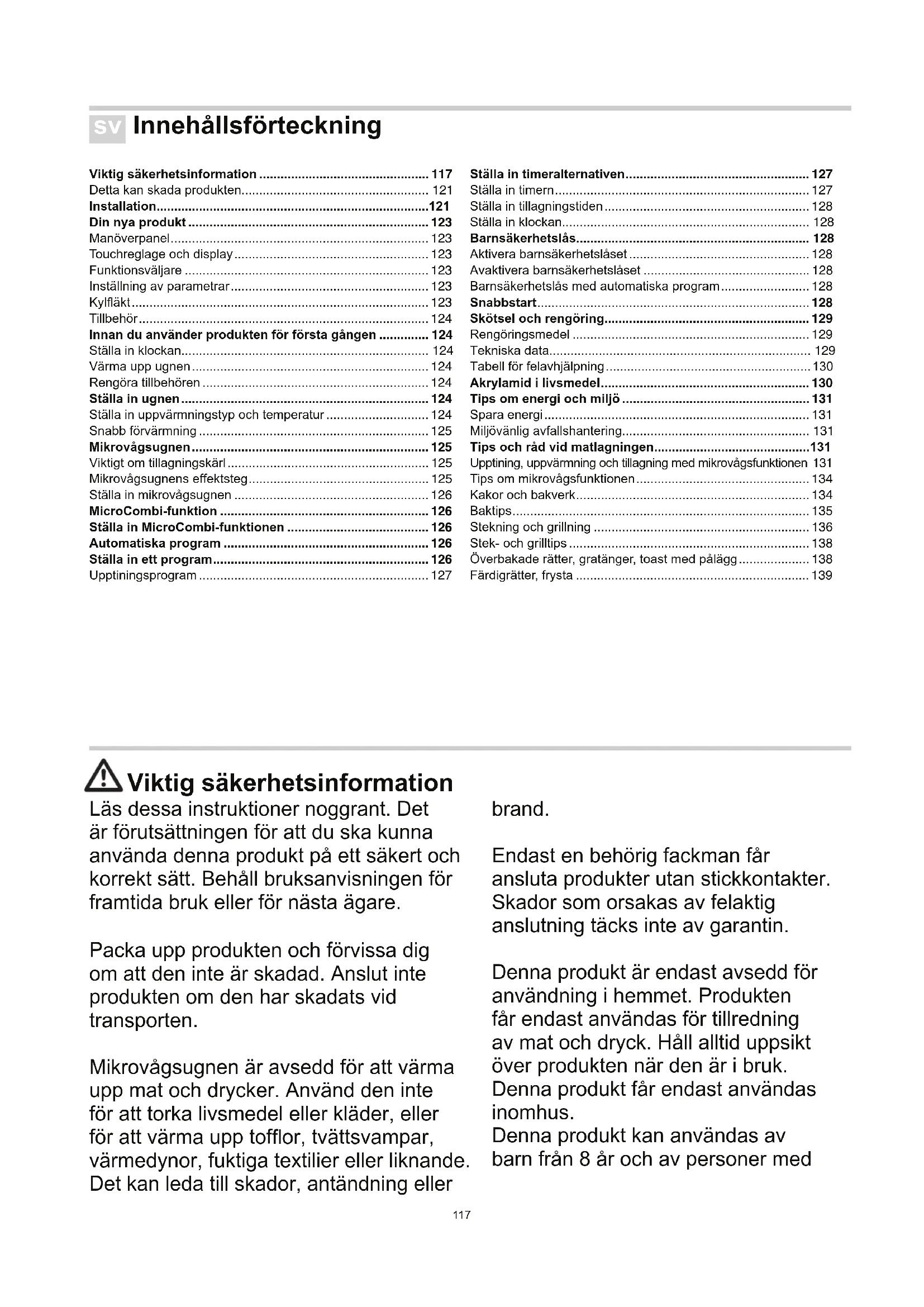 - Preriscaldare il vano di cottura per 5 minuti. ** Disporre il cibo in pirole idonee e resistenti al calore. Tipo di riscaldamento Temperatura °C Potenza del microonde in W Tempo di cottura in minuti117 Innehållsförteckning Viktig säkerhetsinformation ................................................ 117 Detta kan skada produkten..................................................... 121 Installation ............................................................................. 121 Din nya produkt .................................................................... 123 Manöverpanel ......................................................................... 123 Touchreglage och display ....................................................... 123 Funktionsväljare ..................................................................... 123 Inställning av parametrar ........................................................ 123 Kyläkt .................................................................................... 123 Tillbehör .................................................................................. 124 Innan du använder produkten för första gången .............. 124 Ställa in klockan...................................................................... 124 Värma upp ugnen ................................................................... 124 Rengöra tillbehören ................................................................ 124 Ställa in ugnen ...................................................................... 124 Ställa in uppvärmningstyp och temperatur ............................. 124 Snabb förvärmning ................................................................. 125 Mikrovågsugnen ................................................................... 125 Viktigt om tillagningskärl ......................................................... 125 Mikrovågsugnens effektsteg ................................................... 125 Ställa in mikrovågsugnen ....................................................... 126 MicroCombi-funktion ........................................................... 126 Ställa in MicroCombi-funktionen ........................................ 126 Automatiska program .......................................................... 126 Ställa in ett program ............................................................. 126 Upptiningsprogram ................................................................. 127 Ställa in timeralternativen .................................................... 127 Ställa in timern ........................................................................ 127 Ställa in tillagningstiden .......................................................... 128 Ställa in klockan...................................................................... 128 Barnsäkerhetslås.................................................................. 128 Aktivera barnsäkerhetslåset ................................................... 128 Avaktivera barnsäkerhetslåset ............................................... 128 Barnsäkerhetslås med automatiska program ......................... 128 Snabbstart ............................................................................. 128 Skötsel och rengöring .......................................................... 129 Rengöringsmedel ................................................................... 129 Tekniska data.......................................................................... 129 Tabell för felavhjälpning .......................................................... 130 Akrylamid i livsmedel ........................................................... 130 Tips om energi och miljö ..................................................... 131 Spara energi ........................................................................... 131 Miljövänlig avfallshantering..................................................... 131 Tips och råd vid matlagningen ............................................ 131 Upptining, uppvärmning och tillagning med mikrovågsfunktionen 131 Tips om mikrovågsfunktionen ................................................. 134 Kakor och bakverk .................................................................. 134 Baktips .................................................................................... 135 Stekning och grillning ............................................................. 136 Stek- och grilltips .................................................................... 138 Överbakade rätter, gratänger, toast med pålägg .................... 138 Färdigrätter, frysta .................................................................. 139 Viktig säkerhetsinformation Läs dessa instruktioner noggrant. Det är förutsättningen för att du ska kunna använda denna produkt på ett säkert och korrekt sätt. Behåll bruksanvisningen för framtida bruk eller för nästa ägare. Packa upp produkten och förvissa dig om att den inte är skadad. Anslut inte produkten om den har skadats vid transporten. Mikrovågsugnen är avsedd för att värma upp mat och drycker. Använd den inte för att torka livsmedel eller kläder, eller för att värma upp tofor, tvättsvampar, värmedynor, fuktiga textilier eller liknande. Det kan leda till skador, antändning eller brand. Endast en behörig fackman får ansluta produkter utan stickkontakter. Skador som orsakas av felaktig anslutning täcks inte av garantin. Denna produkt är endast avsedd för användning i hemmet. Produkten får endast användas för tillredning av mat och dryck. Håll alltid uppsikt över produkten när den är i bruk. Denna produkt får endast användas inomhus. Denna produkt kan användas av barn från 8 år och av personer med sv118 begränsad fysisk, sensorisk eller mental förmåga, eller med bristande erfarenhet och kunskap, under förutsättning att de får tillsyn eller handleds så