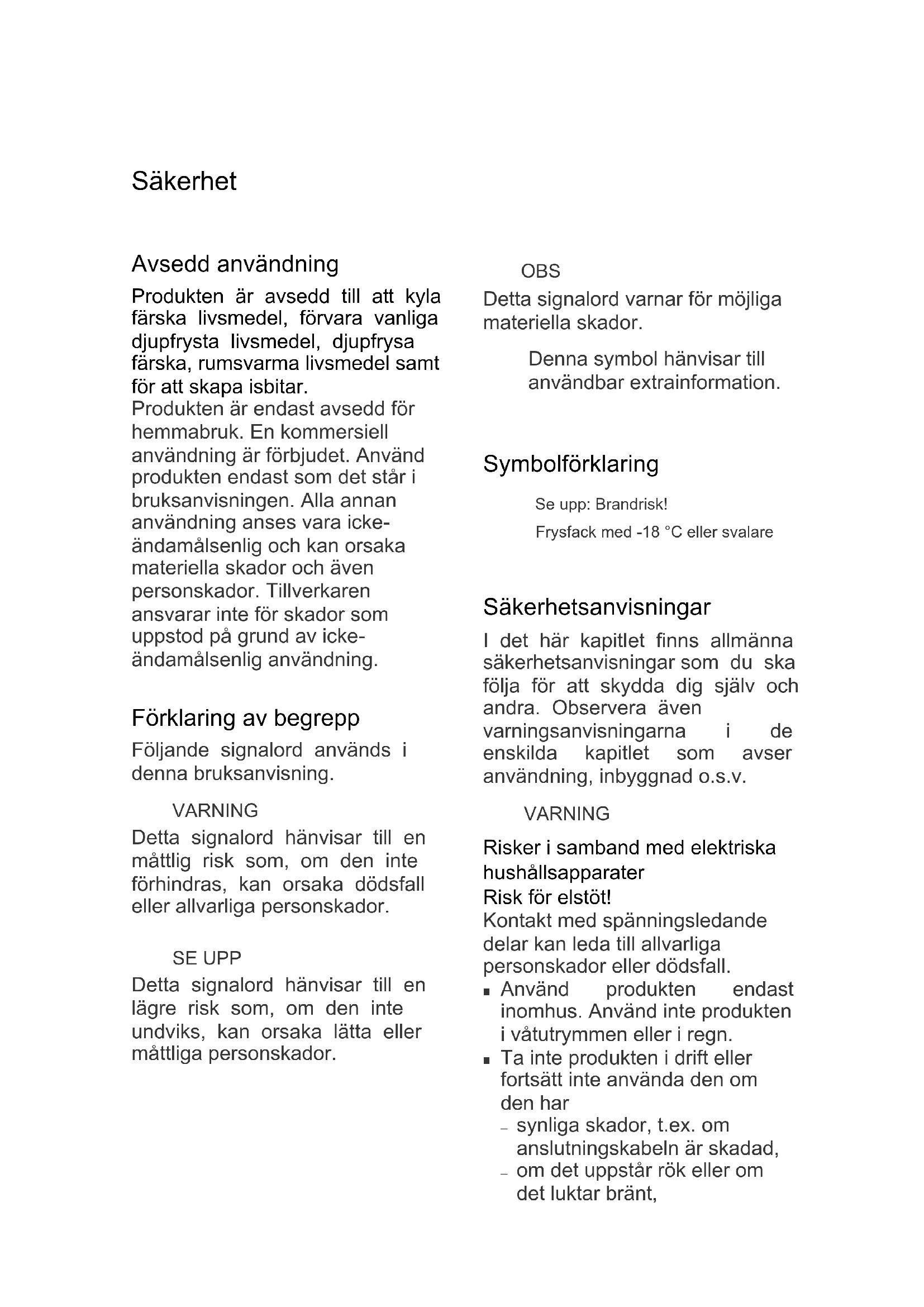 om det finns transportskador på produkten ska du kontakta vår service (se sida 263). VARNING! Risk för elstöt! Ta aldrig en skadad produkt i drift.Sida 149 Produktkomponenter/Manöv erkomponenter Produktkomponenter/Manöverkomponenter (1) Frysfack (2) Innerbelysning (3) Temperaturregul ator (4) Dörrfack (5) Dörrfack (6) Flaskhylla (7) Frukt- och gröntlådor (8) Glashylla, fastmonterad (9) Glashylla, flyttbar (1) (2) (3) (7) (8) (9) (4) (5) (6)Säkerhet Sida 150 Säkerhet Avsedd användning Produkten är avsedd till att kyla färska livsmedel, förvara vanliga djupfrysta livsmedel, djupfrysa färska, rumsvarma livsmedel samt för att skapa isbitar. Produkten är endast avsedd för hemmabruk. En kommersiell användning är förbjudet. Använd produkten endast som det står i bruksanvisningen. Alla annan användning anses vara icke- ändamålsenlig och kan orsaka materiella skador och även personskador. Tillverkaren ansvarar inte för skador som uppstod på grund av icke- ändamålsenlig användning. Förklaring av begrepp Följande signalord används i denna bruksanvisning. VARNING Detta signalord hänvisar till en måttlig risk som, om den inte förhindras, kan orsaka dödsfall eller allvarliga personskador. SE UPP Detta signalord hänvisar till en lägre risk som, om den inte undviks, kan orsaka lätta eller måttliga personskador. OBS Detta signalord varnar för möjliga materiella skador. Denna symbol hänvisar till användbar extrainformation. Symbolförklaring Se upp: Brandrisk! Frysfack med -18 °C eller svalare Säkerhetsanvisningar I det här kapitlet finns allmänna säkerhetsanvisningar som du ska följa för att skydda dig själv och andra. Observera även varningsanvisningarna i de enskilda kapitlet som avser användning, inbyggnad o.s.v. VARNING Risker i samband med elektriska hushållsapparater Risk för elstöt! Kontakt med spänningsledande delar kan leda till allvarliga personskador eller dödsfall.