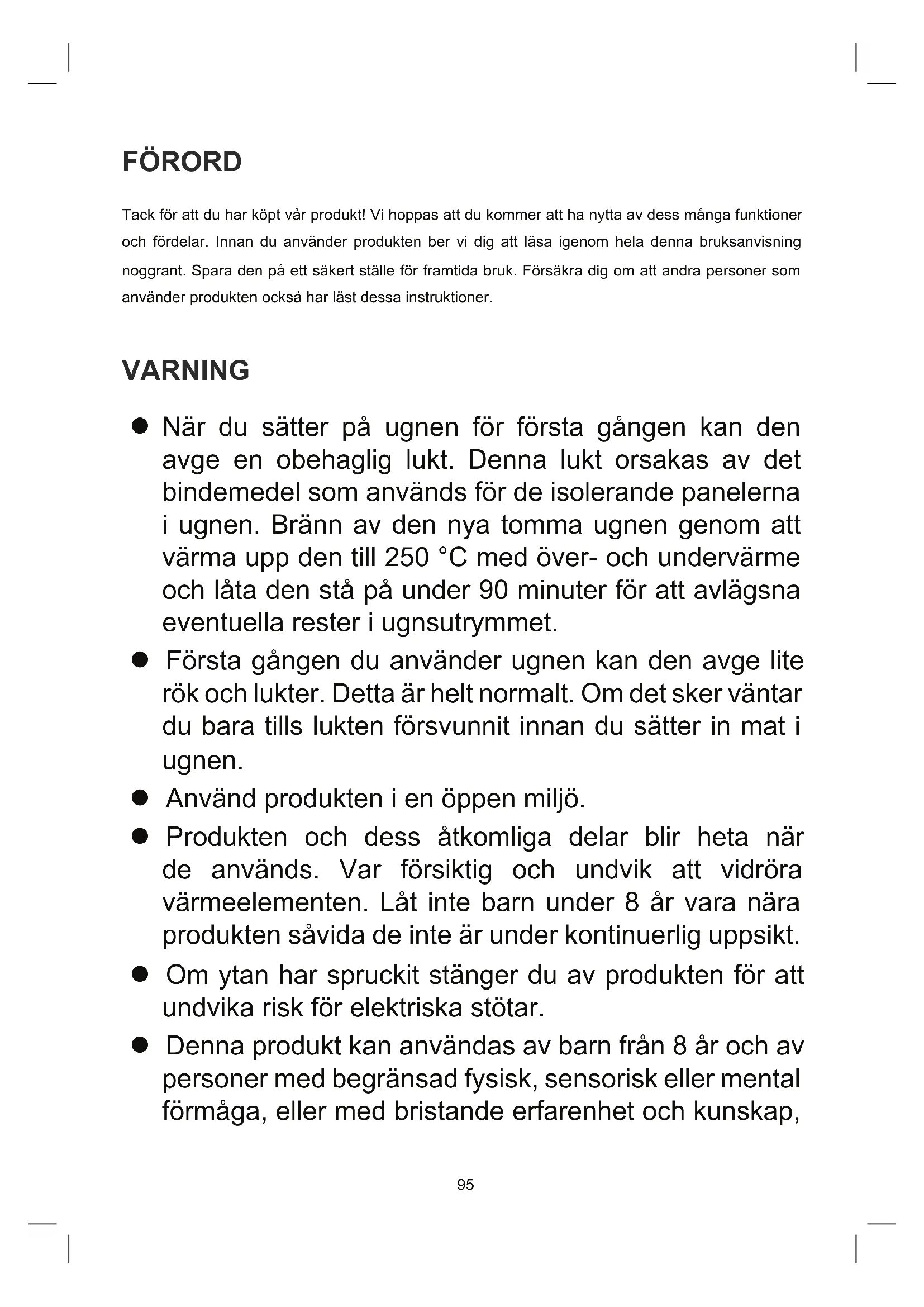 När du sätter på ugnen för första gången kan den avge en obehaglig lukt. Denna lukt orsakas av det bindemedel som används för de isolerande panelerna i ugnen. Bränn av den nya tomma ugnen genom att värma upp den till 250 °C med över- och undervärme och låta den stå på under 90 minuter för att avlägsna eventuella rester i ugnsutrymmet. Första gången du använder ugnen kan den avge lite rök och lukter. Detta är helt normalt. Om det sker väntar du bara tills lukten försvunnit innan du sätter in mat i ugnen. Använd produkten i en öppen miljö. Produkten och dess åtkomliga delar blir heta när de används. Var försiktig och undvik att vidröra värmeelementen. Låt inte barn under 8 år vara nära produkten såvida de inte är under kontinuerlig uppsikt. Om ytan har spruckit stänger du av produkten för att undvika risk för elektriska stötar. Denna produkt kan användas av barn från 8 år och av personer med begränsad fysisk, sensorisk eller mental förmåga, eller med bristande erfarenhet och kunskap,96 under förutsättning att de får tillsyn eller handleds så att de kan använda produkten på ett säkert sätt och förstår vilka faror som är förknippade med användningen. Barn ska inte leka med produkten. Rengöring och underhåll ska inte utföras av barn utan uppsikt. Produkten blir mycket het när den används. Var försiktig så att du undviker att vidröra värmeelementen inuti ugnen. Låt inte barn vara i närheten av ugnen när den är i drift, speciellt om grillfunktionen används.
