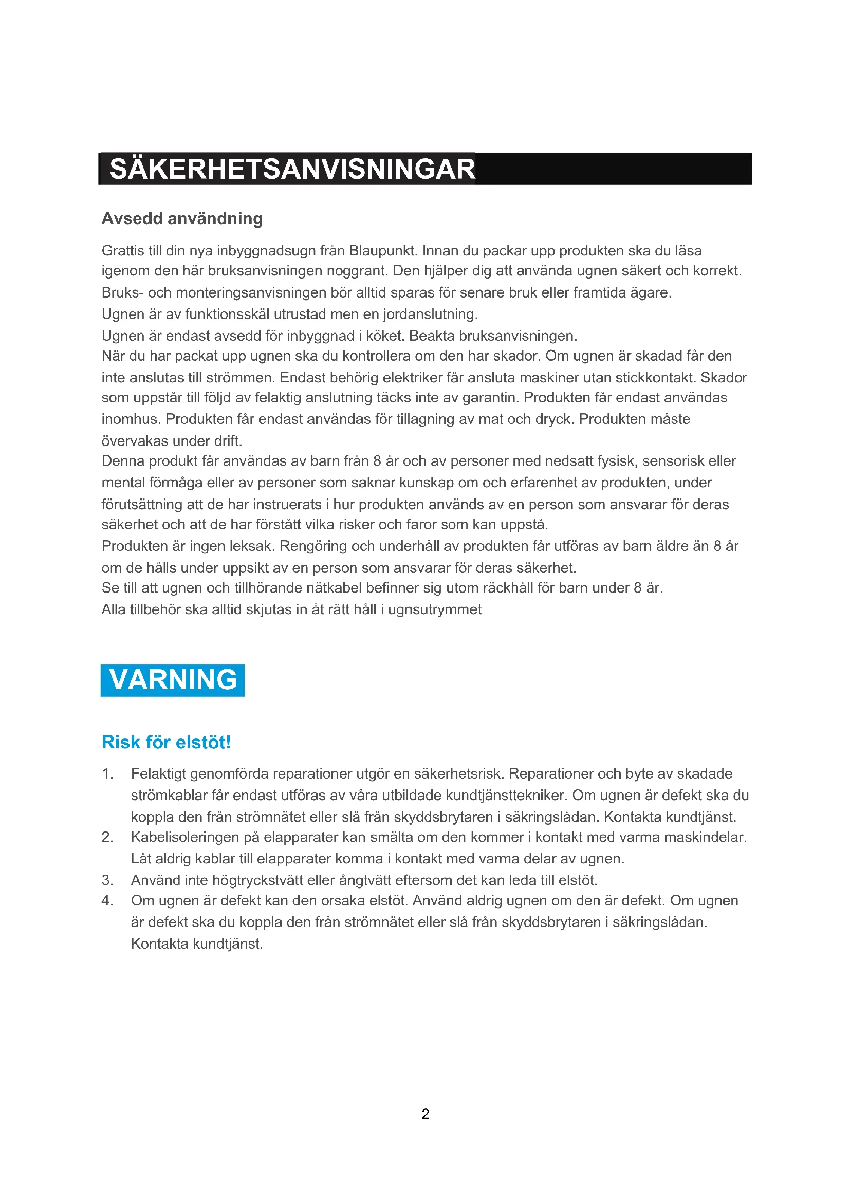 SÄKERHETSANVISNINGAR Avsedd användning Grattis till din nya inbyggnadsugn från Blaupunkt. Innan du packar upp produkten ska du läsa igenom den här bruksanvisningen noggrant. Den hjälper dig att använda ugnen säkert och korrekt. Bruks- och monteringsanvisningen bör alltid sparas för senare bruk eller framtida ägare. Ugnen är av funktionsskäl utrustad men en jordanslutning. Ugnen är endast avsedd för inbyggnad i köket. Beakta bruksanvisningen. När du har packat upp ugnen ska du kontrollera om den har skador. Om ugnen är skadad får den inte anslutas till strömmen. Endast behörig elektriker får ansluta maskiner utan stickkontakt. Skador som uppstår till följd av felaktig anslutning täcks inte av garantin. Produkten får endast användas inomhus. Produkten får endast användas för tillagning av mat och dryck. Produkten måste övervakas under drift. Denna produkt får användas av barn från 8 år och av personer med nedsatt fysisk, sensorisk eller mental förmåga eller av personer som saknar kunskap om och erfarenhet av produkten, under förutsättning att de har instruerats i hur produkten används av en person som ansvarar för deras säkerhet och att de har förstått vilka risker och faror som kan uppstå. Produkten är ingen leksak. Rengöring och underhåll av produkten får utföras av barn äldre än 8 år om de hålls under uppsikt av en person som ansvarar för deras säkerhet. Se till att ugnen och tillhörande nätkabel befinner sig utom räckhåll för barn under 8 år. Alla tillbehör ska alltid skjutas in åt rätt håll i ugnsutrymmet
