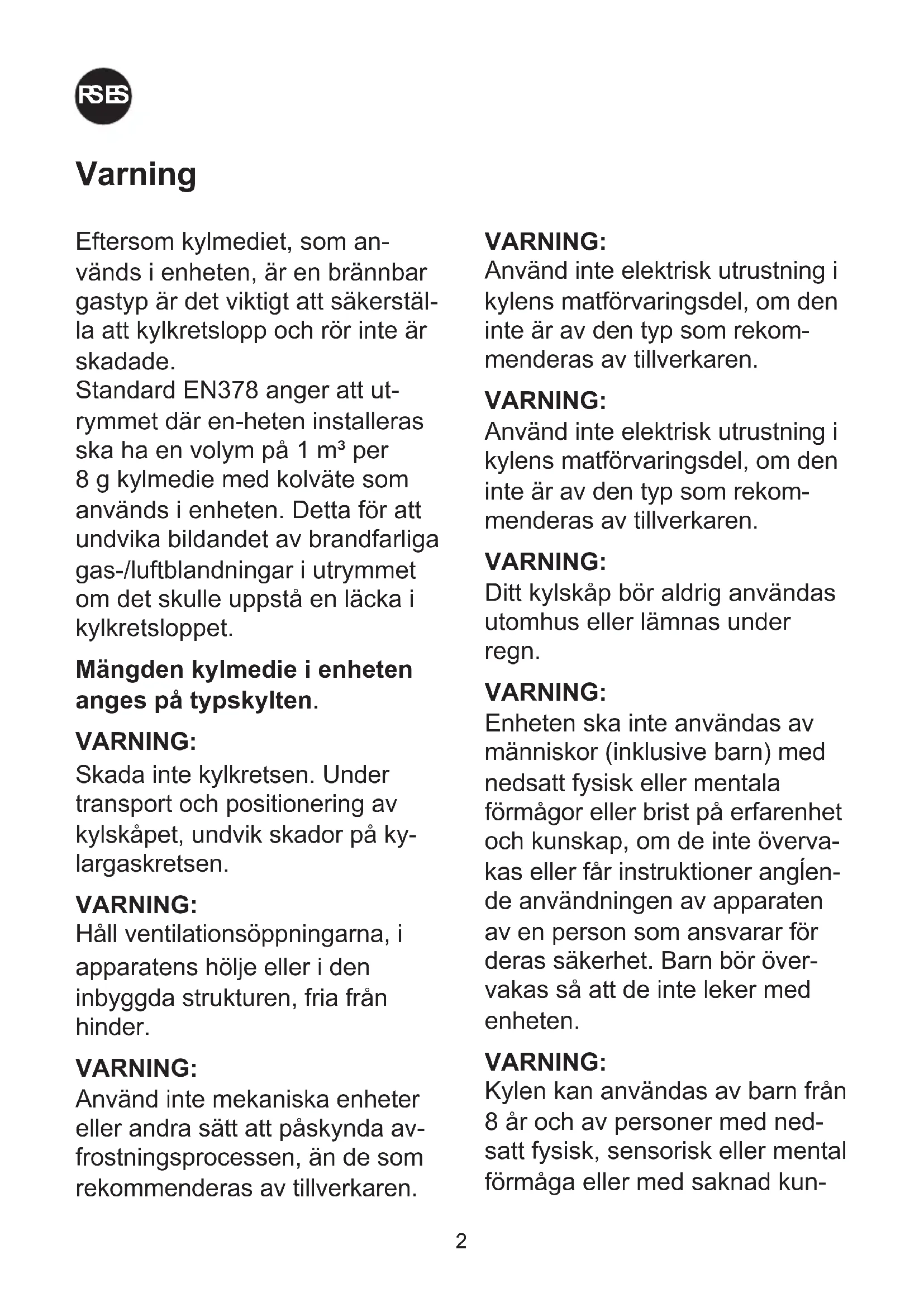 Varning Eftersom kylmediet, som an- vänds i enheten, är en brännbar gastyp är det viktigt att säkerstäl- la att kylkretslopp och rör inte är skadade. Standard EN378 anger att ut- rymmet där en-heten installeras ska ha en volym på 1 m³ per 8 g kylmedie med kolväte som används i enheten. Detta för att undvika bildandet av brandfarliga gas-/luftblandningar i utrymmet om det skulle uppstå en läcka i kylkretsloppet. Mängden kylmedie i enheten anges på typskylten. VARNING: Skada inte kylkretsen. Under transport och positionering av kylskåpet, undvik skador på ky- largaskretsen. VARNING: Håll ventilationsöppningarna, i apparatens hölje eller i den inbyggda strukturen, fria från hinder. VARNING: Använd inte mekaniska enheter eller andra sätt att påskynda av- frostningsprocessen, än de som rekommenderas av tillverkaren. VARNING: Använd inte elektrisk utrustning i kylens matförvaringsdel, om den inte är av den typ som rekom- menderas av tillverkaren. VARNING: Använd inte elektrisk utrustning i kylens matförvaringsdel, om den inte är av den typ som rekom- menderas av tillverkaren. VARNING: Ditt kylskåp bör aldrig användas utomhus eller lämnas under regn. VARNING: Enheten ska inte användas av människor (inklusive barn) med nedsatt fysisk eller mentala förmågor eller brist på erfarenhet och kunskap, om de inte överva- kas eller får instruktioner angĺen- de användningen av apparaten av en person som ansvarar för deras säkerhet. Barn bör över- vakas så att de inte leker med enheten. VARNING: Kylen kan användas av barn från 8 år och av personer med ned- satt fysisk, sensorisk eller mental förmåga eller med saknad kun-3 RUS