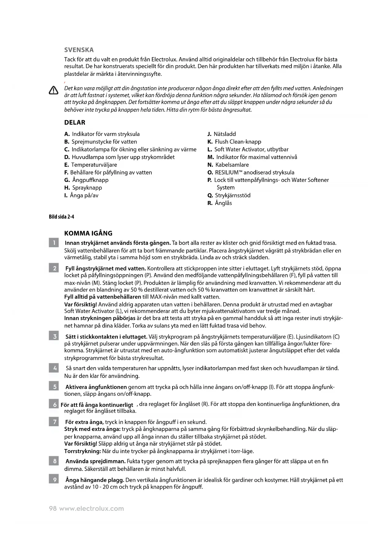 1 Innan strykjärnet används första gången. Ta bort alla rester av klister och gnid försiktigt med en fuktad trasa. Skölj vattenbehållaren för att ta bort främmande partiklar. Placera ångstrykjärnet vågrätt på strykbrädan eller en värmetålig, stabil yta i samma höjd som en strykbräda. Linda av och sträck sladden. 2 Fyll ångstrykjärnet med vatten. Kontrollera att stickproppen inte sitter i eluttaget. Lyft strykjärnets stöd, öppna locket på påfyllningsöppningen (P). Använd den medföljande vattenpåfyllningsbehållaren (F), fyll på vatten till max-nivån (M). Stäng locket (P). Produkten är lämplig för användning med kranvatten. Vi rekommenderar att du använder en blandning av 50 % destillerat vatten och 50 % kranvatten om kranvattnet är särskilt hårt. Fyll alltid på vattenbehållaren till MAX-nivån med kallt vatten. Var försiktig! Använd aldrig apparaten utan vatten i behållaren. Denna produkt är utrustad med en avtagbar Soft Water Activator (L), vi rekommenderar att du byter mjukvattenaktivatorn var tredje månad. Innan strykningen påbörjas är det bra att testa att stryka på en gammal handduk så att inga rester inuti strykjär- net hamnar på dina kläder. Torka av sulans yta med en lätt fuktad trasa vid behov. 3 Sätt i stickkontakten i eluttaget. Välj strykprogram på ångstrykjärnets temperaturväljare (E). Ljusindikatorn (C) på strykjärnet pulserar under uppvärmningen. När den slås på första gången kan tillfälliga ångor/lukter före- komma. Strykjärnet är utrustat med en auto-ångfunktion som automatiskt justerar ångutsläppet efter det valda strykprogrammet för bästa strykresultat. 4 Så snart den valda temperaturen har uppnåtts, lyser indikatorlampan med fast sken och huvudlampan är tänd. Nu är den klar för användning. 5 Aktivera ångfunktionen genom att trycka på och hålla inne ångans on/o-knapp (I). För att stoppa ångfunk- tionen, släpp ångans on/o-knapp. 6 För att få ånga kontinuerligt , dra reglaget för ånglåset (R). För att stoppa den kontinuerliga ångfunktionen, dra reglaget för ånglåset tillbaka. 7 För extra ånga, tryck in knappen för ångpu i en sekund. Stryk med extra ånga: tryck på ångknapparna på samma gång för förbättrad skrynkelbehandling. När du släp- per knapparna, använd upp all ånga innan du ställer tillbaka strykjärnet på stödet. Var försiktig! Släpp aldrig ut ånga när strykjärnet står på stödet. Torrstrykning: När du inte trycker på ångknapparna är strykjärnet i torr-läge. 8 Använda sprejdimman. Fukta tyger genom att trycka på sprejknappen era gånger för att släppa ut en n dimma. Säkerställ att behållaren är minst halvfull. 9 Ånga hängande plagg. Den vertikala ångfunktionen är idealisk för gardiner och kostymer. Håll strykjärnet på ett avstånd av 10 - 20 cm och tryck på knappen för ångpu.99www.electrolux.com