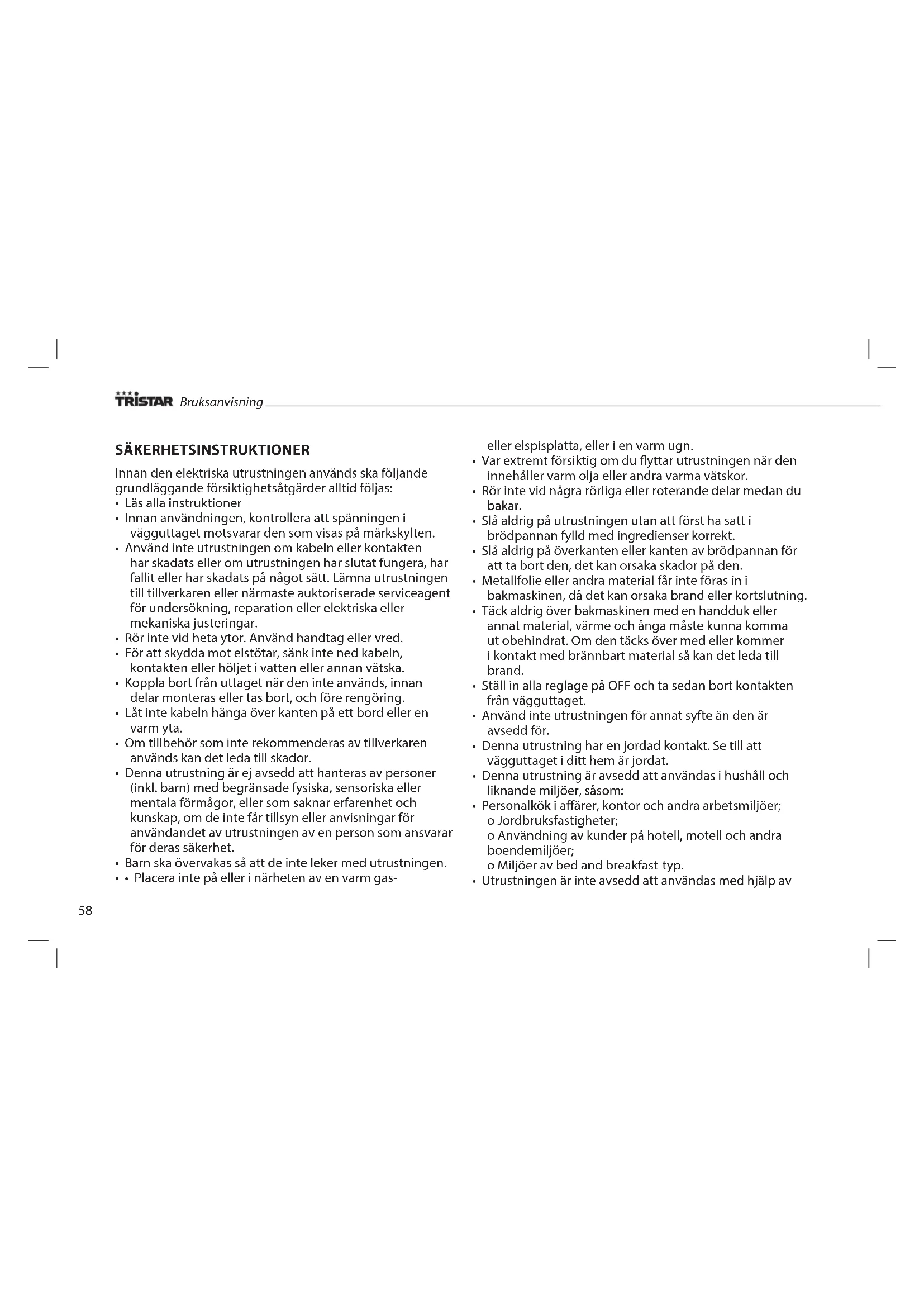 - För detaljerade garantivillkor, se vår servicewebbplats: www.tristar.eu RIKTLINJER FÖR SKYDDANDE AV MILJÖN Denna utrustning får inte kastas i hushållssoporna när den slitits ut, utan måste lämnas in på en återvinningsanläggning för elektrisk och elektronisk hushållsutrustning. Denna symbol på utrustningen, instruktionshandboken och förpackningen informerar dig om denna viktiga fråga. Materialet som använts i denna utrustning kan återvinnas. Genom att återvinna förbrukad hushållsutrustning bidrar du till skyddet av miljön. Kontakta dina lokala myndigheter för information om återvinningsställen.
