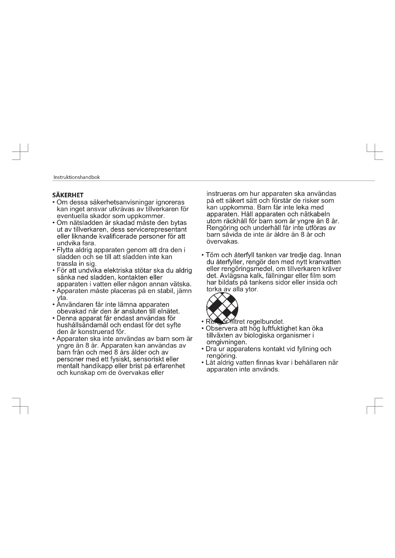 - Låt aldrig vatten finnas kvar i behållaren när apparaten inte används.Instruktionshandbok