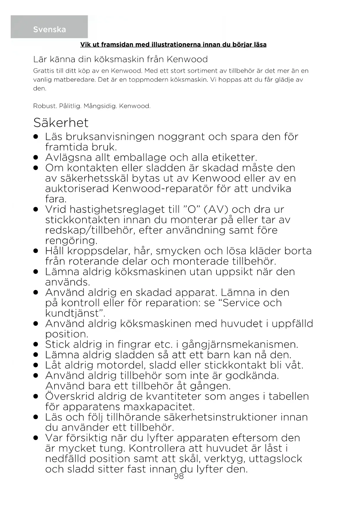 Var försiktig när du lyfter apparaten eftersom den är mycket tung. Kontrollera att huvudet är låst i nedfälld position samt att skål, verktyg, uttagslock och sladd sitter fast innan du lyfter den. Svenska Vik ut framsidan med illustrationerna innan du börjar läsa 98O Var försiktig när du tar bort skålverktygen efter långvarig användning eftersom de kan bli heta.