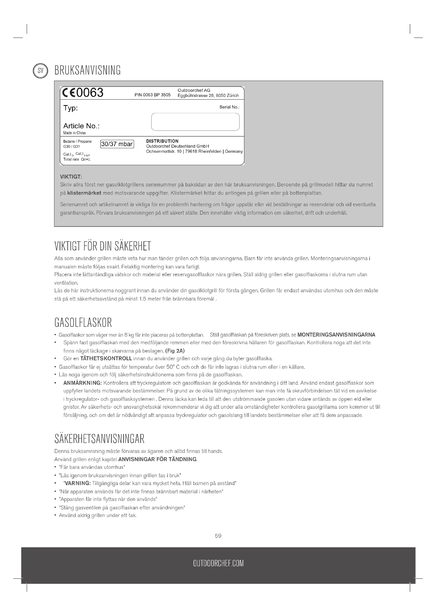 - ”När apparaten används får det inte finnas brännbart material i närheten”• ”Apparaten får inte flyttas när den används”• ”Stäng gasventilen på gasolflaskan efter användningen”• Använd aldrig grillen under ett tak.VIKTIGT:Skriv allra först ner gasolklotgrillens serienummer på baksidan av den här bruksanvisningen. Beroende på grillmodell hittar du numret på klistermärket med motsvarande uppgifter. Klistermärket hittar du antingen på grillen eller på bottenplattan. Serienumret och artikelnumret är viktiga för en problemfri hantering om frågor uppstår eller vid beställningar av reservdelar och vid eventuella garantianspråk. Förvara bruksanvisningen på ett säkert ställe. Den innehåller viktig information om säkerhet, drift och underhåll.