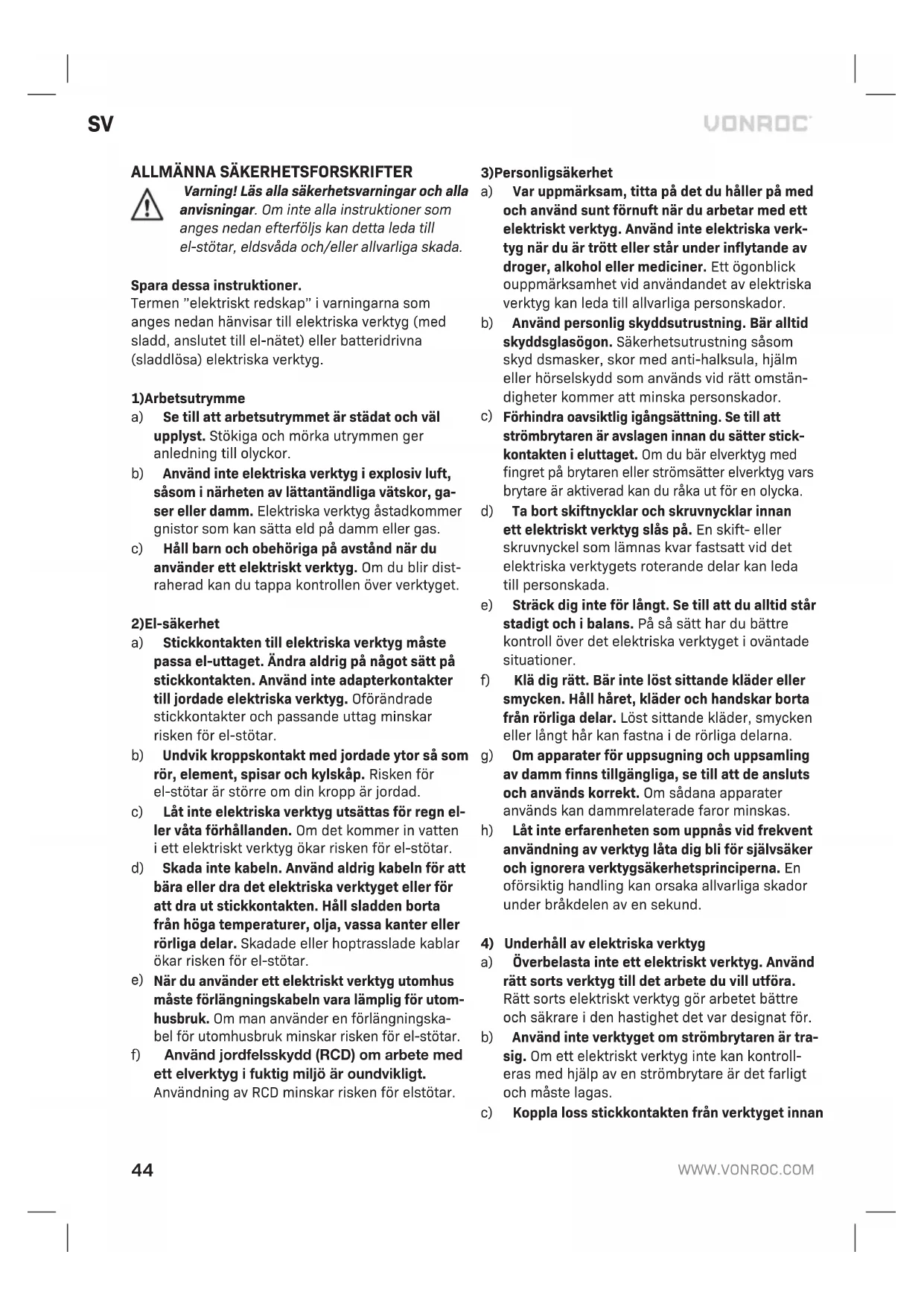 MILJÖ Felaktig och/eller kasserad elektrisk eller elektronisk utrustning måste lämnas in på lämpliga återvinningsstationer. Endast för EU-länder Kassera inte elverktyg i hushållsavfall. Enligt den europeiska riktlinjen 2012/19/EU om kasserad elektrisk och elektronisk utrustning och dess tillämpning i nationell rätt måste elverktyg som inte längre är användbara samlas in separat och kasseras på ett miljövänligt sätt. GARANTI VONROC produkter ar utvecklade enligt hogsta kva- litetsstandard och garanteras vara utan defekter bade vad galler material och tillverkning under den period som stipuleras enligt lag med borjan fran ursprungligt inkopsdatum. Om nagot fel uppstar pa produkten under denna period pa grund av material- och/eller tillverkningsfel skall VONROC kontaktas direkt. Foljande omstandigheter exkluderas fran denna garanti: