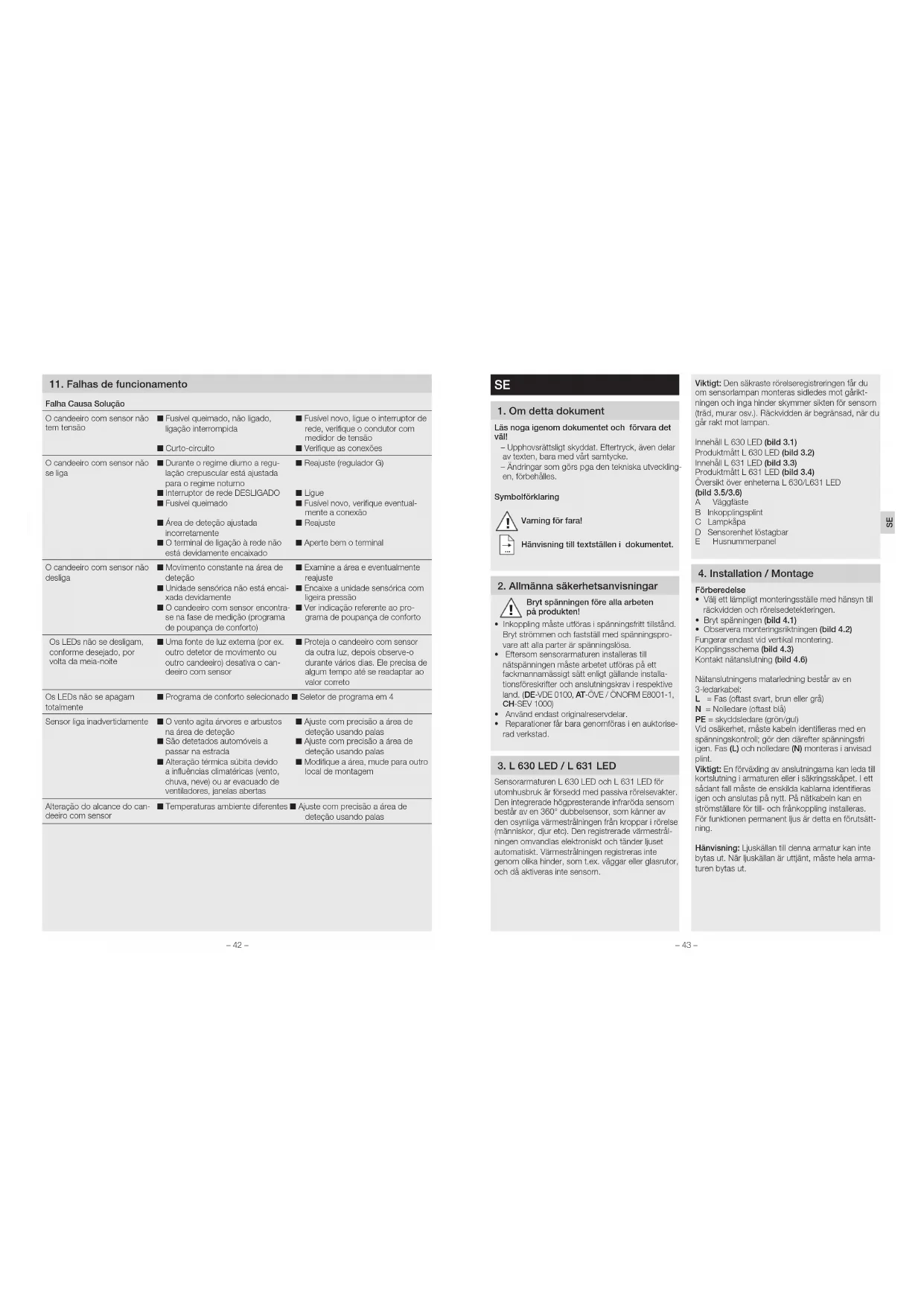 Sensorarmaturen L630LED och L631LED för utomhusbruk är försedd med passiva rörelsevakter. Den integrerade högpresterande infraröda sensorn består av en 360° dubbelsensor, som känner av den osynliga värmestrålningen från kroppar i rörelse (människor, djur etc). Den registrerade värmestrål- ningen omvandlas elektroniskt och tänder ljuset automatiskt. Värmestrålningen registreras inte genom olika hinder, som t.ex. väggar eller glasrutor, och då aktiveras inte sensorn. Viktigt: Den säkraste rörelseregistreringen får du om sensorlampan monteras sidledes mot gårikt- ningen och inga hinder skymmer sikten för sensorn (träd, murar osv.). Räckvidden är begränsad, när du går rakt mot lampan. Innehåll L630LED (bild 3.1) Produktmått L630LED (bild 3.2) Innehåll L631LED (bild 3.3) Produktmått L631LED (bild 3.4) Översikt över enheterna L 630/L631 LED (bild 3.5/3.6) A Väggfäste B Inkopplingsplint C Lampkåpa D Sensorenhet löstagbar E Husnummerpanel