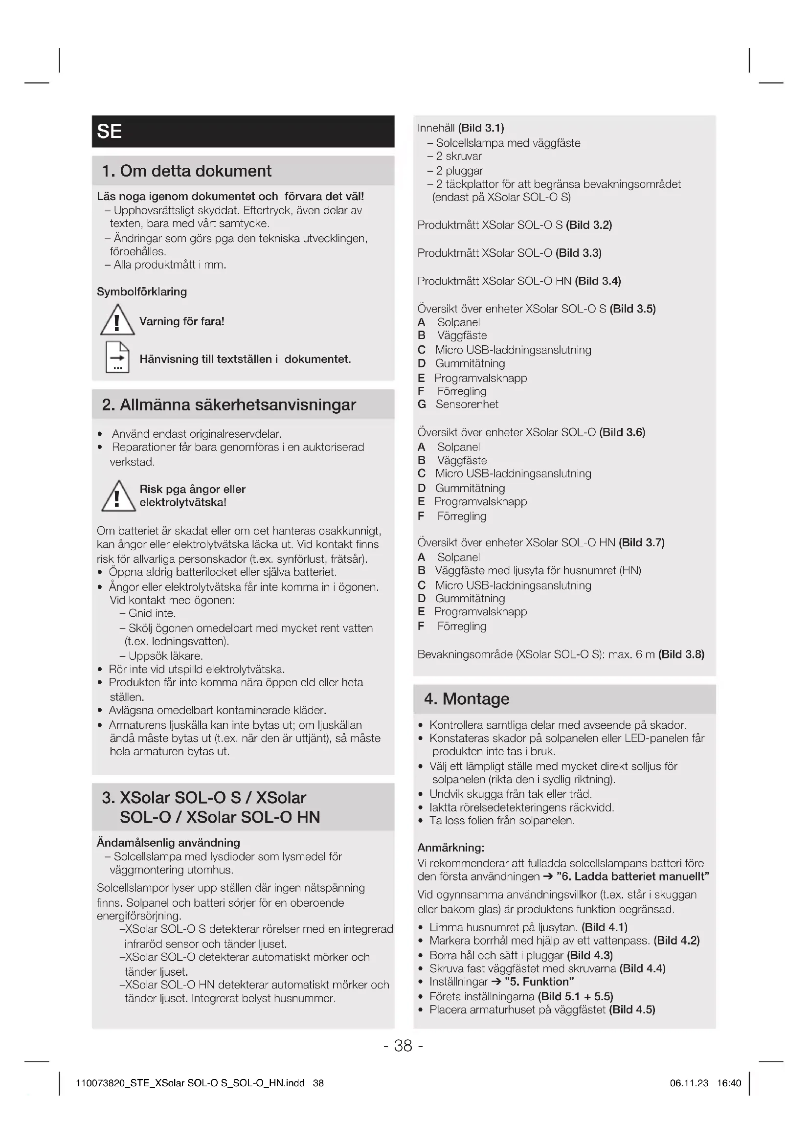 110073820_STE_XSolar SOL-O S_SOL-O_HN.indd 37110073820_STE_XSolar SOL-O S_SOL-O_HN.indd 37 06.11.23 16:4006.11.23 16:40- 38 - Innehåll (Bild 31) – Solcellslampa med väggfäste – 2 skruvar – 2 pluggar – 2 täckplattor för att begränsa bevakningsområdet (endast på XSolarSOL-OS) Produktmått XSolarSOL-OS (Bild32) Produktmått XSolarSOL-O(Bild33) Produktmått XSolarSOL-OHN (Bild34) Översikt över enheter XSolarSOL-OS(Bild35) A Solpanel B Väggfäste C Micro USB-laddningsanslutning D Gummitätning E Programvalsknapp F Förregling G Sensorenhet Översikt över enheter XSolarSOL-O(Bild 36) A Solpanel B Väggfäste C Micro USB-laddningsanslutning D Gummitätning E Programvalsknapp F Förregling Översikt över enheter XSolarSOL-OHN(Bild 37) A Solpanel B Väggfäste med ljusyta för husnumret (HN) C Micro USB-laddningsanslutning D Gummitätning E Programvalsknapp F Förregling Bevakningsområde (XSolarSOL-OS): max. 6m (Bild38) 4 Montage