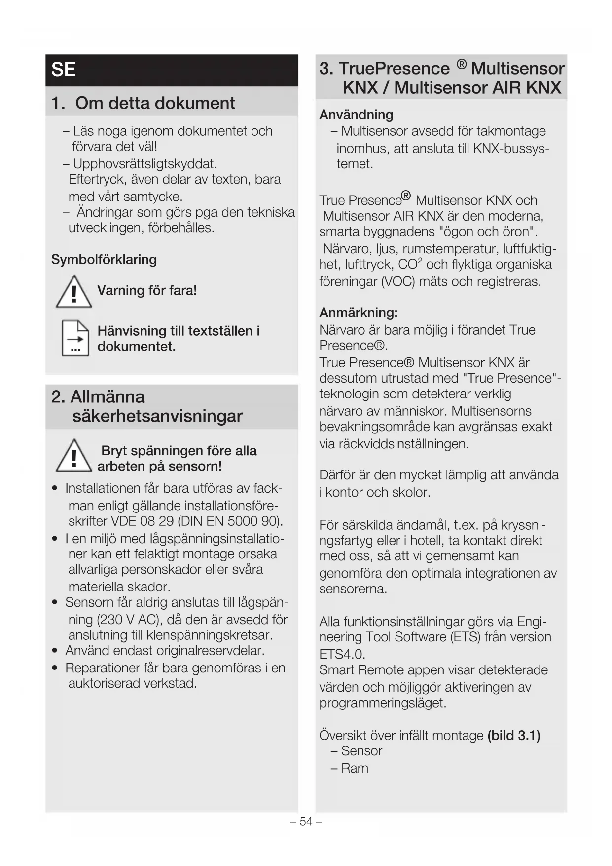 Multisensor KNX och Multisensor AIR KNX är den moderna, smarta byggnadens "ögon och öron". Närvaro, ljus, rumstemperatur, luftfuktig- het, lufttryck, CO² och flyktiga organiska föreningar (VOC) mäts och registreras. Anmärkning: Närvaro är bara möjlig i förandet True Presence®. True Presence® Multisensor KNX är dessutom utrustad med "TruePresence"- teknologin som detekterar verklig närvaro av människor. Multisensorns bevakningsområde kan avgränsas exakt via räckviddsinställningen. Därför är den mycket lämplig att använda i kontor och skolor. För särskilda ändamål, t.ex. på kryssni- ngsfartyg eller i hotell, ta kontakt direkt med oss, så att vi gemensamt kan genomföra den optimala integrationen av sensorerna. Alla funktionsinställningar görs via Engi- neering Tool Software (ETS) från version ETS4.0. Smart Remote appen visar detekterade värden och möjliggör aktiveringen av programmeringsläget. Översikt över infällt montage (bild 3.1) – Sensor – Ram– 54 – – 55 – – Montera sensorn på ramen (bild 5.3)