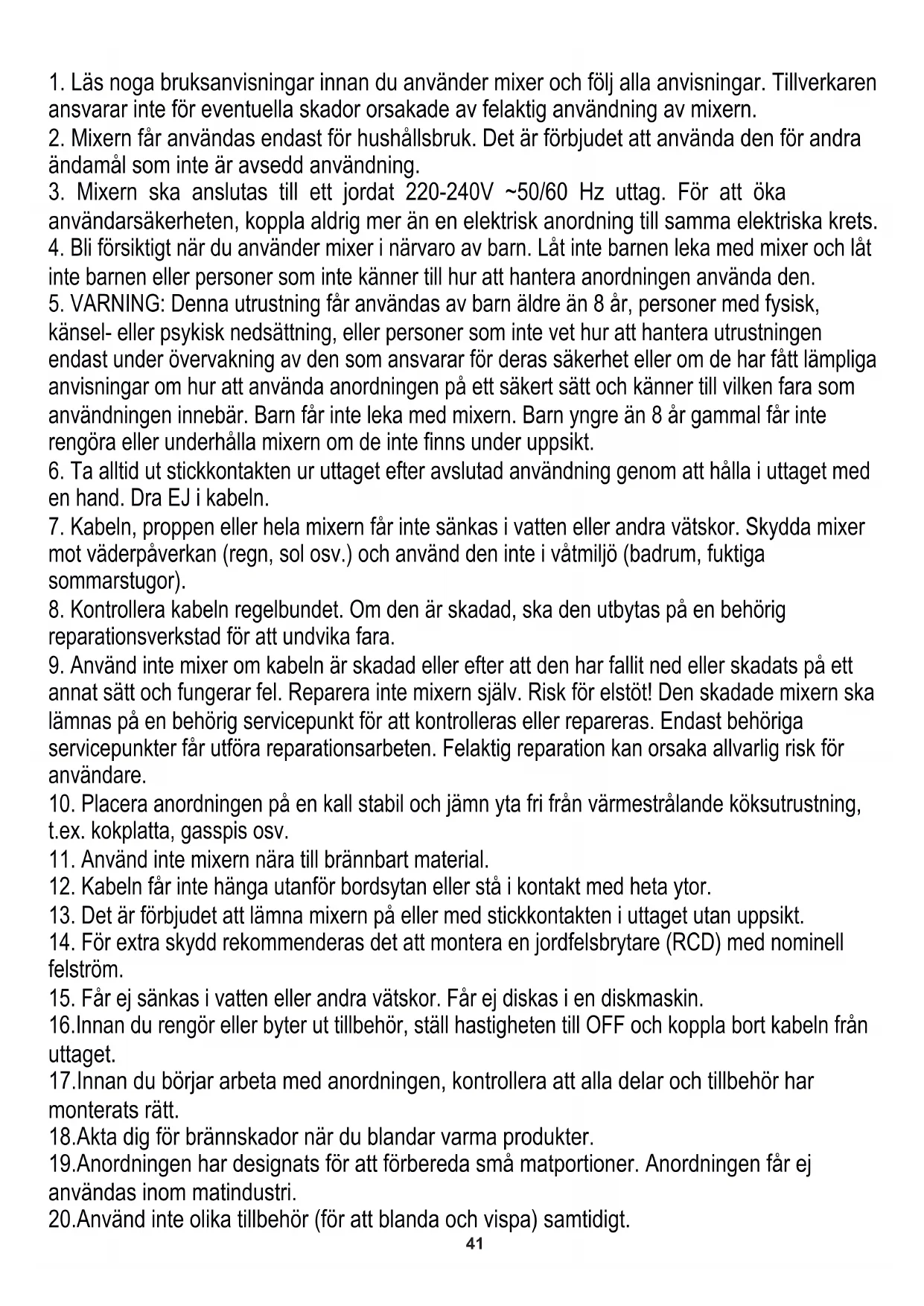1. Läs noga bruksanvisningar innan du använder mixer och följ alla anvisningar. Tillverkaren