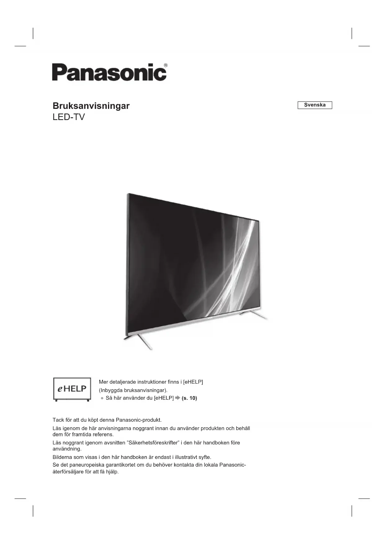 Mer information om programvaran med öppen källkod finns i (Start > Inställningar > Enhetsinställningar > Om > Juridisk information) Mer produktinformation finns på EPREL: https://eprel.ec.europa.eu. EPREL-registreringsnummer finns på https://eprel.panasonic.eu/product.Kundens anteckning Modellnummer och serienummer för den här produkten finns på den bakre panelen. Du bör notera serienumret här nedan och behålla den här boken, plus ditt inköpskvitto, som en permanent handling för ditt köp för att underlätta identifiering i händelse av stöld eller förlust och i garantisyften. Modellnummer Serienummer Panasonic Marketing Europe GmbH Hagenauer Strasse 43, D-65203 Wiesbaden, Tyskland Webbplats: http://www.panasonic.com Svenska Kassering av gammal utrustning och batterier Endast för Europeiska unionen och länder med återvinningssystem De här symbolerna på produkter, förpackning och/eller medföljande dokument innebär att använda elektriska och elektroniska produkter och batterier inte får blandas med vanligt hushållsavfall. För korrekt hantering, återanvändning och återvinning av gamla produkter och använda batterier ska du lämna dem på lämpligt insamlingsställe enligt nationell lagstiftning. Genom att kassera dem korrekt bidrar du till att spara värdefulla resurser och förhindrar potentiella negativa effekter på hälsa och miljö. För mer information om insamling och återvinning, kontakta din kommun. Straffrättsliga åtgärder kan tillämpas vid felaktig avfallshantering enligt nationell lagstiftning. Om batterisymbolen (nedersta symbolen): Den här symbolen kan användas i kombination med en kemisk symbol. I det här fallet överensstämmer den med de krav som finns i direktivet för den kemikalien.Bruksanvisning LED-TV Norsk Takk for at du kjøpte dette Panasonic-produktet. Les disse instruksjonene nøye før du bruker dette produktet, og ta vare på dem for senere referanse. Les sikkerhetsforskriftene i denne håndboken nøye før bruk. Bildene som vises i denne håndboken, er bare ment som illustrasjon. Se det europeiske garantikortet hvis du må kontakte din lokale Panasonic-forhandler for å få støtte. Hvis du vil ha mer detaljerte instruksjoner, kan du se [eHELP] (Innebygd bruksanvisning).