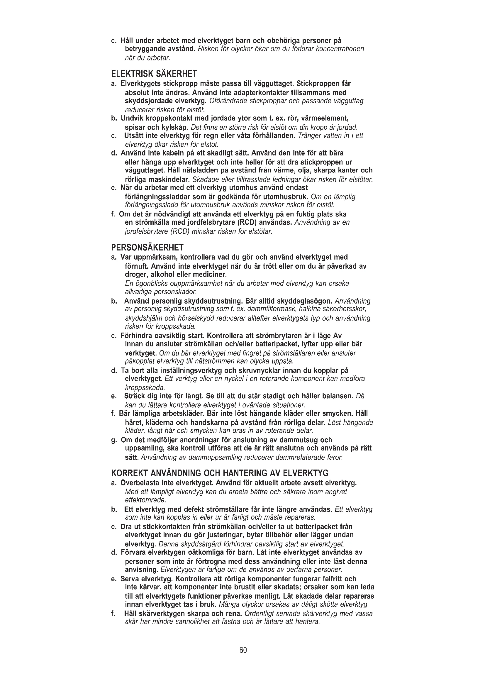 a. Håll arbetsområdet rent och välbelyst. Oordning och dåligt belyst arbetsområde kan leda till olyckor. b. Använd inte elverktyget i explosionsfarlig omgivning med brännbara vätskor, gaser eller damm. Elverktyg avger gnistor som kan antända damm eller gas.60 c. Håll under arbetet med elverktyget barn och obehöriga personer på betryggande avstånd. Risken för olyckor ökar om du förlorar koncentrationen när du arbetar.