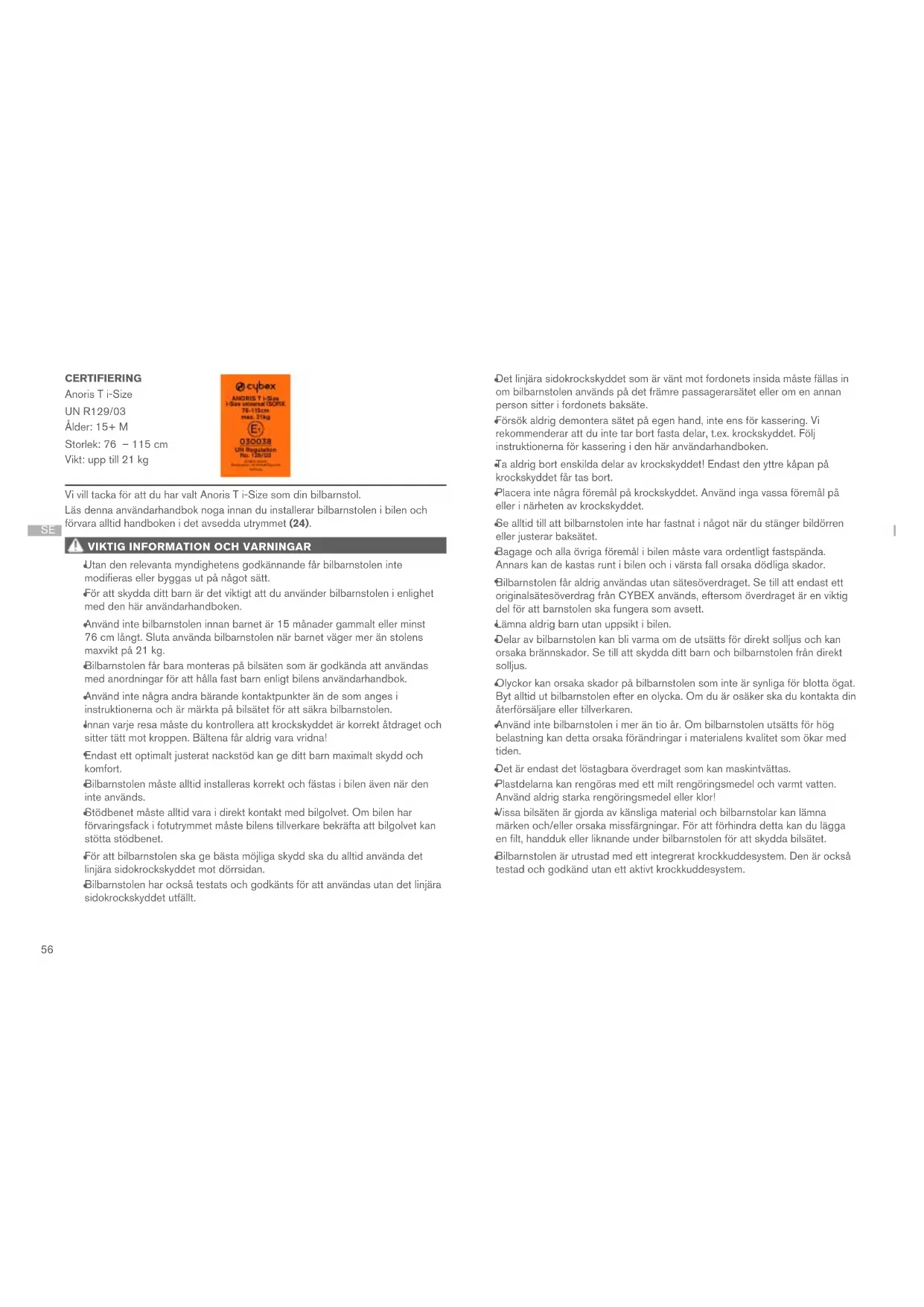 CYBEX GmbH (Riedingerstr. 18, 95448 Bayreuth, Tyskland) ger dig tre års garanti på denna produkt. Garantin gäller i landet där produkten först såldes till en kund genom återförsäljarkanaler. Garantibestämmelserna och all information som krävs för att göra ett garantikrav finns på vår hemsida go.cybex-online.com/manufacturer-warranty-car-seats. Om en garanti anges i varans beskrivning förblir dina lagenliga rättigheter gentemot oss avseende fel opåverkade. Bilbarnstolen och dess komponenter är klassade som särskilt avfall och får inte kastas i hushållssoporna. Produkten måste bortskaffas i enlighet med regionala bestämmelser. All aktuell information om kassering i ditt land finns på go.cybex-online.com/anoris-t-isize-disposal. SE60 Takk for at du valgte Anoris T i-Size som ditt barnebilsete. Les denne bruksveiledningen nøye før du installerer barnebilsetet i bilen din og ha alltid veiledningen for hånden i rommet som er tenkt for den (24).