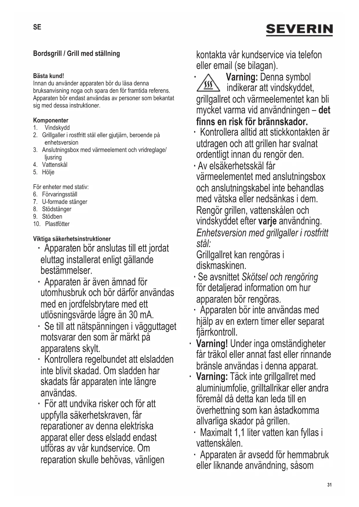 Varning: Denna symbol indikerar att vindskyddet, grillgallret och värmeelementet kan bli mycket varma vid användningen – det nns en risk för brännskador. ∙ Kontrollera alltid att stickkontakten är utdragen och att grillen har svalnat ordentligt innan du rengör den. ∙ Av elsäkerhetsskäl får värmeelementet med anslutningsbox och anslutningskabel inte behandlas med vätska eller nedsänkas i dem. Rengör grillen, vattenskålen och vindskyddet efter varje användning. Enhetsversion med grillgaller i rostfritt stål: Grillgallret kan rengöras i diskmaskinen. ∙ Se avsnittet Skötsel och rengöring för detaljerad information om hur apparaten bör rengöras. ∙ Apparaten bör inte användas med hjälp av en extern timer eller separat fjärrkontroll. ∙ Varning! Under inga omständigheter får träkol eller annat fast eller rinnande bränsle användas i denna apparat. ∙ Varning: Täck inte grillgallret med aluminiumfolie, grilltallrikar eller andra föremål då detta kan leda till en överhettning som kan åstadkomma allvarliga skador på grillen. ∙ Maximalt 1,1 liter vatten kan fyllas i vattenskålen. ∙ Apparaten är avsedd för hemmabruk eller liknande användning, såsom SE32 142 x 208 mm - i personalkök, kontor och andra kommersiella miljöer, - i företag inom jordbrukssektorn, - för gäster i hotell, motell och liknande inkvarteringsställen, - för gäster i bed-and-breakfast hus. ∙ Denna apparat kan användas av barn (minst 8 år gamla) och av personer som har minskad fysisk rörelseförmåga, reducerat sinnes- eller mentaltillstånd, eller som har bristfällig erfarenhet och kunskap, förutsatt att dessa personer är under uppsyn eller har fått tillräckliga instruktioner beträffande apparatens användning och vet vilka risker och säkerhetsåtgärder som användningen innefattar. ∙ Barn bör inte tillåtas leka med apparaten. ∙ Barn bör inte tillåtas rengöra eller göra service på apparaten ifall de inte är övervakade och minst 8 år gamla. ∙ Apparaten och dess elsladd bör hållas utom räckhåll för barn under 8 år. ∙ Varning: Håll barn på avstånd från apparatens förpackningsmaterial eftersom fara eventuellt kan uppstå. Det nns t.ex. risk för kvävning. ∙ Kontrollera noga om det märks några fel på huvudenheten och dess tilläggsutrustning innan apparaten används. Om apparaten t ex har tappats på en hård yta får den inte längre användas: t o m osynliga skador kan försämra apparatens driftsäkerhet. ∙ Under användningen bör grillen placeras på en värmebeständig yta, som tål stänk och äckar. När man tillreder mat som innehåller mycket fett eller vätska kan man ibland inte undvika stänk. ∙ Placera inte grillen nära en vägg eller i en vrå och se till att det inte nns lättantändliga material i närheten. ∙ Vindskyddet får inte installeras vid användning inomhus. ∙ Fet grillad mat kan antändas, så häll vatten i vattenskålen före varje användning! Sätt först därefter i stickkontakten. Detta kyler vattenskålen, minskar rök och underlättar rengöringen. ∙ Håll vattennivån under kontroll. Fyll på mer vatten i god tid och var noggrann så att vattnet inte kommer i kontakt med värmeelementet. Varning: Koppla alltid grillen från eluttaget innan du fyller på vatten. ∙ Före idrifttagning ska du kontrollera att värmeelementet är korrekt isatt i huset och i vattenbehållaren. ∙ Grillen bör alltid användas under övervakning. ∙ Värmeelementet och grillgallret är mycket hett under drift. Vidrör inte värmeelementet även, efter det är avstängt och medan det fortfarande är varmt. Det nns risk för brännskador! ∙ Se till att elsladden inte kommer i kontakt med apparatens heta ytor. ∙ Kontrollera elsladdens läge så att ingen kan snava över den. ∙ Dra alltid stickproppen ur vägguttaget - innan du fyller reektorbrickan med vatten, - efter användning, - om apparaten krånglar, - innan du rengör apparaten. ∙ Användning av förlängningskabel eller sladdvinda förorsakar ett spänningsfall och eventuellt även en upphettning inuti kabeln. Det är därför viktigt att rulla ut kabeln fullständigt innan apparaten kopplas på. Kontrollera att förlängningskabeln är godkänd för utomhusbruk och för effekten som specicerats (se märkskylten). ∙ För enheter med stativ: Förvaringsstället kan laddas med maximalt 4 kg. ∙ Flytta aldrig grillen medan den används. ∙ Observera! Låt alltid grillen svalna helt och hållet innan du yttar, rengör, övertäcker eller förvarar den. ∙ Observera! När grillen inte används måste värmeelementet med anslutningskopplingsdosan tas bort från grillen och förvaras torrt. ∙ De andra delarna av grillen får inte förvaras utomhus eller på öppna platser där de kan påverkas av vädret. ∙ Inget ansvar godtas om skada uppkommer till följd av felaktig användning, eller om dessa instruktioner inte följts. ∙ Denna produkt uppfyller de krav som är gällande för CE-märkning. Innan grillen används första gången ∙ Avlägsna apparatens förpackningsmaterial och klistermärken. ∙ De fyra silikonslangarna tas också bort från värmeelementets tvärsträvor. ∙ Rengör grillgallret, vattenskålen och vindskyddet i varmt tvålvatten och torka noggrant. ∙ Montera ihop apparaten enligt beskrivningen i Förberedning av enheten. ∙ Låt grillen värmas upp ca 10 minuter vid maximal effekt utan mat (se Grillning). Detta kommer att ta bort lukten som ofta uppstår när man först sätter igång grillen. Litet rök kan uppstå; vädra därför ordentligt genom att öppna33 142 x 208 mm fönster eller balkongdörrar; en köksäkt kan också fungera. Montering av grillen ∙ Montera ihop grillen enligt bilderna: ∙ Placera vattenskålen i huset. ∙ Placera värmeelementet med anslutningsboxen i vattenbehållaren. Enheten är utrustad med en säkerhetsbrytare. Om anslutningsboxen inte är korrekt installerad kan enh