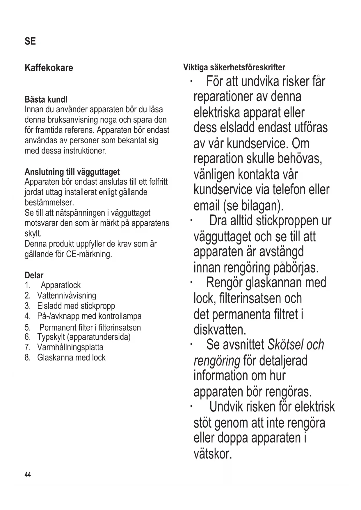 Viktiga säkerhetsföreskrifter ∙ Förattundvikariskerfår reparationer av denna elektriska apparat eller dess elsladd endast utföras av vår kundservice. Om reparation skulle behövas, vänligen kontakta vår kundservice via telefon eller email (se bilagan). ∙ Dra alltid stickproppen ur vägguttaget och se till att apparaten är avstängd innan rengöring påbörjas. ∙ Rengör glaskannan med lock,lterinsatsenoch detpermanentaltreti diskvatten. ∙ Se avsnittet Skötsel och rengöring för detaljerad information om hur apparaten bör rengöras. ∙ Undvik risken för elektrisk stöt genom att inte rengöra eller doppa apparaten i vätskor. SE104 x 142 mm