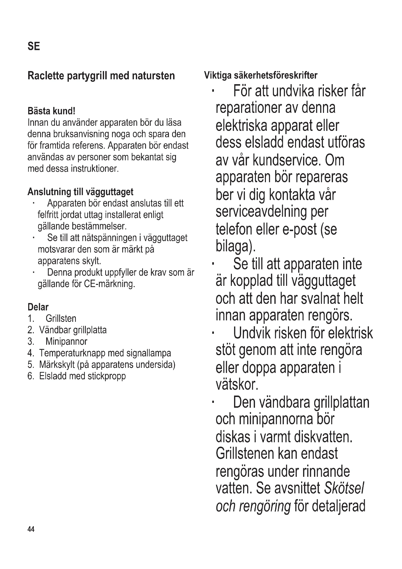 Viktiga säkerhetsföreskrifter ∙ För att undvika risker får reparationer av denna elektriska apparat eller dess elsladd endast utföras av vår kundservice. Om apparaten bör repareras ber vi dig kontakta vår serviceavdelning per telefon eller e-post (se bilaga). ∙ Se till att apparaten inte är kopplad till vägguttaget och att den har svalnat helt innan apparaten rengörs. ∙ Undvik risken för elektrisk stöt genom att inte rengöra eller doppa apparaten i vätskor. ∙ Den vändbara grillplattan och minipannorna bör diskas i varmt diskvatten. Grillstenen kan endast rengöras under rinnande vatten. Se avsnittet Skötsel och rengöring för detaljerad SE104 x 142 mm