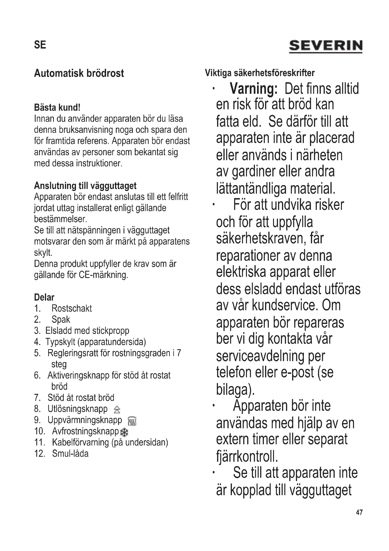 Viktiga säkerhetsföreskrifter ∙ Varning:Detnnsalltid en risk för att bröd kan fatta eld. Se därför till att apparaten inte är placerad eller används i närheten av gardiner eller andra lättantändliga material. ∙ För att undvika risker och för att uppfylla säkerhetskraven, får reparationer av denna elektriska apparat eller dess elsladd endast utföras av vår kundservice. Om apparaten bör repareras ber vi dig kontakta vår serviceavdelning per telefon eller e-post (se bilaga). ∙ Apparaten bör inte användas med hjälp av en extern timer eller separat fjärrkontroll. ∙ Se till att apparaten inte är kopplad till vägguttaget SE48 104 x 142 mm och att den har svalnat helt innan apparaten rengörs. ∙ Undvik risken för elektrisk stöt genom att inte rengöra eller doppa apparaten i vätskor. ∙ Torka av stödet åt rostat bröd och kapslingen utifrån med en lätt fuktad trasa. ∙ Ta bort smulbrickan för tömning genom att dra ut den åt brödrostens sida. Kontrollera att smulbrickan har lagts tillbaka på sin plats innan brödrosten används igen. ∙ Apparaten är avsedd för hemmabruk eller liknande användning, såsom - i personalkök, kontor och andra kommersiella miljöer, - i företag inom jordbrukssektorn, - för gäster i hotell, motell och liknande inkvarteringsställen, - för gäster i bed-and- breakfast hus. ∙ Denna apparat kan användas av barn (minst 8 år gamla) och av personer som har minskad fysisk rörelseförmåga, reducerat sinnes- eller mentaltillstånd, eller som har bristfällig erfarenhet och kunskap, förutsatt att dessa personer är under uppsyn eller har fått tillräckliga instruktioner beträffande apparatens användning och vet vilka risker och säkerhetsåtgärder som användningen innefattar. ∙ Barn bör inte tillåtas leka med apparaten. ∙ Barn bör inte tillåtas rengöra eller göra service på apparaten ifall de inte är övervakade och minst 8 år gamla.104 x 142 mm
