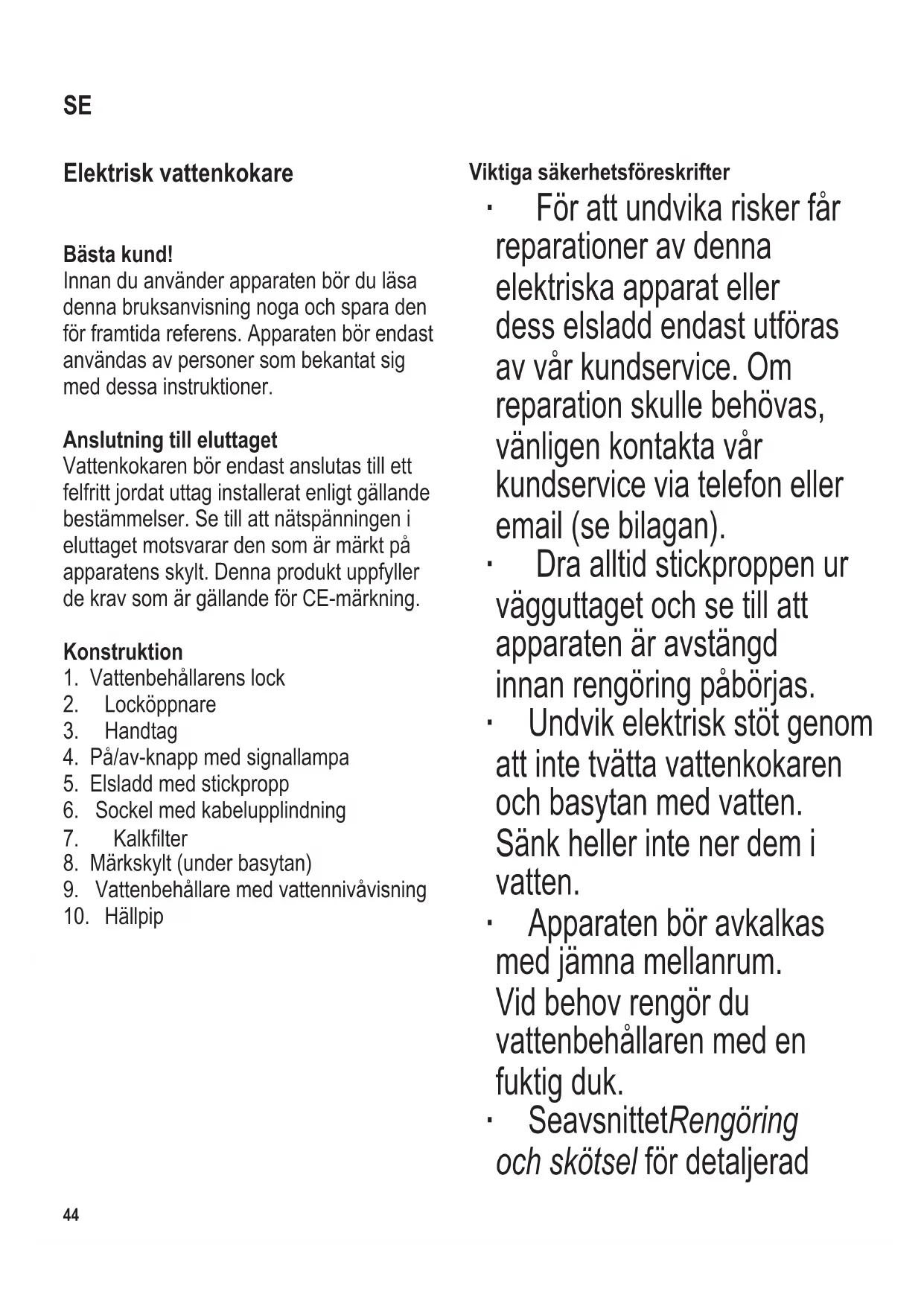Viktiga säkerhetsföreskrifter ∙ För att undvika risker får reparationer av denna elektriska apparat eller dess elsladd endast utföras av vår kundservice. Om reparation skulle behövas, vänligen kontakta vår kundservice via telefon eller email (se bilagan). ∙ Dra alltid stickproppen ur vägguttaget och se till att apparaten är avstängd innan rengöring påbörjas. ∙ Undvik elektrisk stöt genom att inte tvätta vattenkokaren och basytan med vatten. Sänk heller inte ner dem i vatten. ∙ Apparaten bör avkalkas med jämna mellanrum. Vid behov rengör du vattenbehållaren med en fuktig duk. ∙ Se avsnittet Rengöring och skötsel för detaljerad SE104 x 142 mm