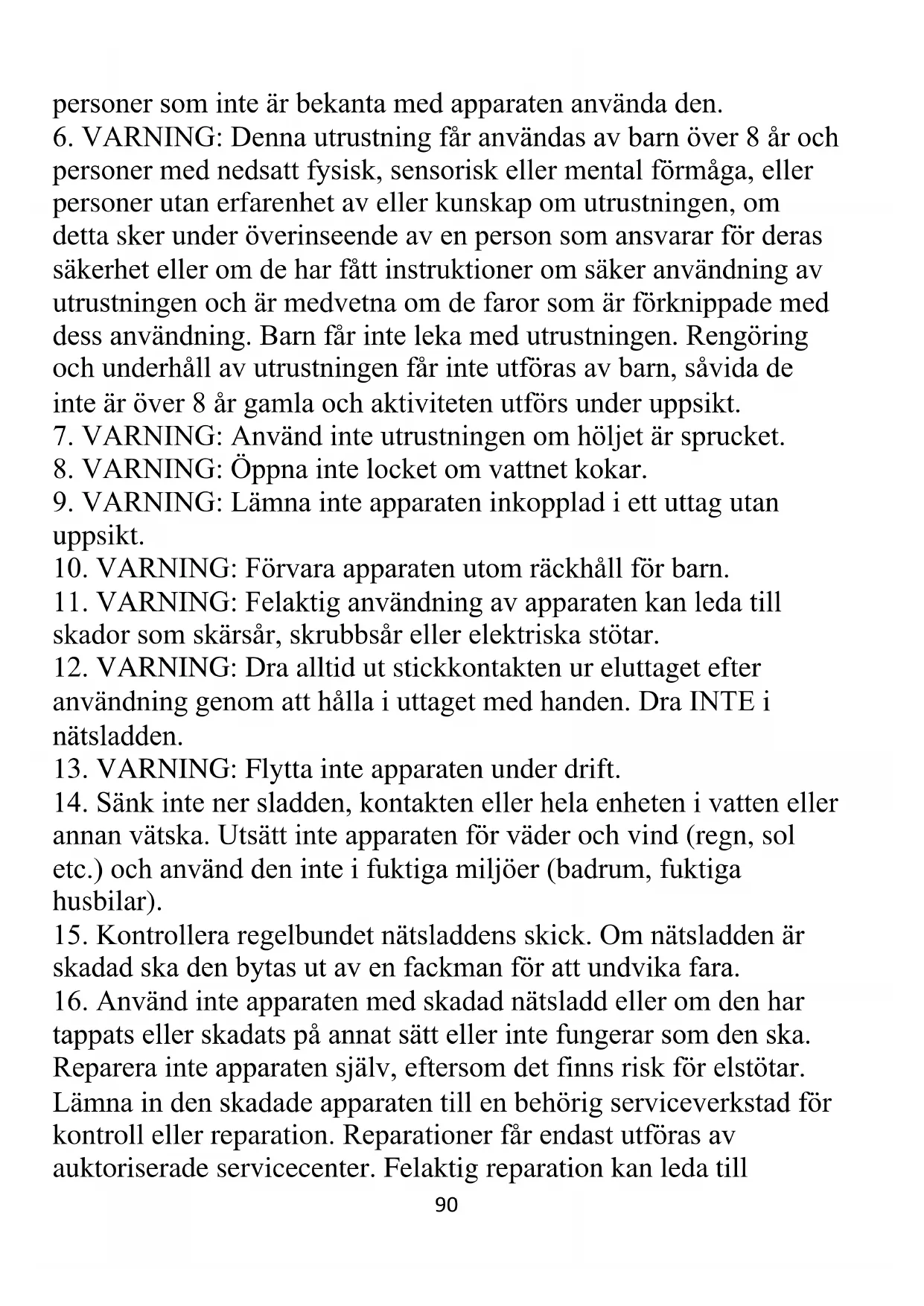 6. VARNING: Denna utrustning får användas av barn över 8 år och