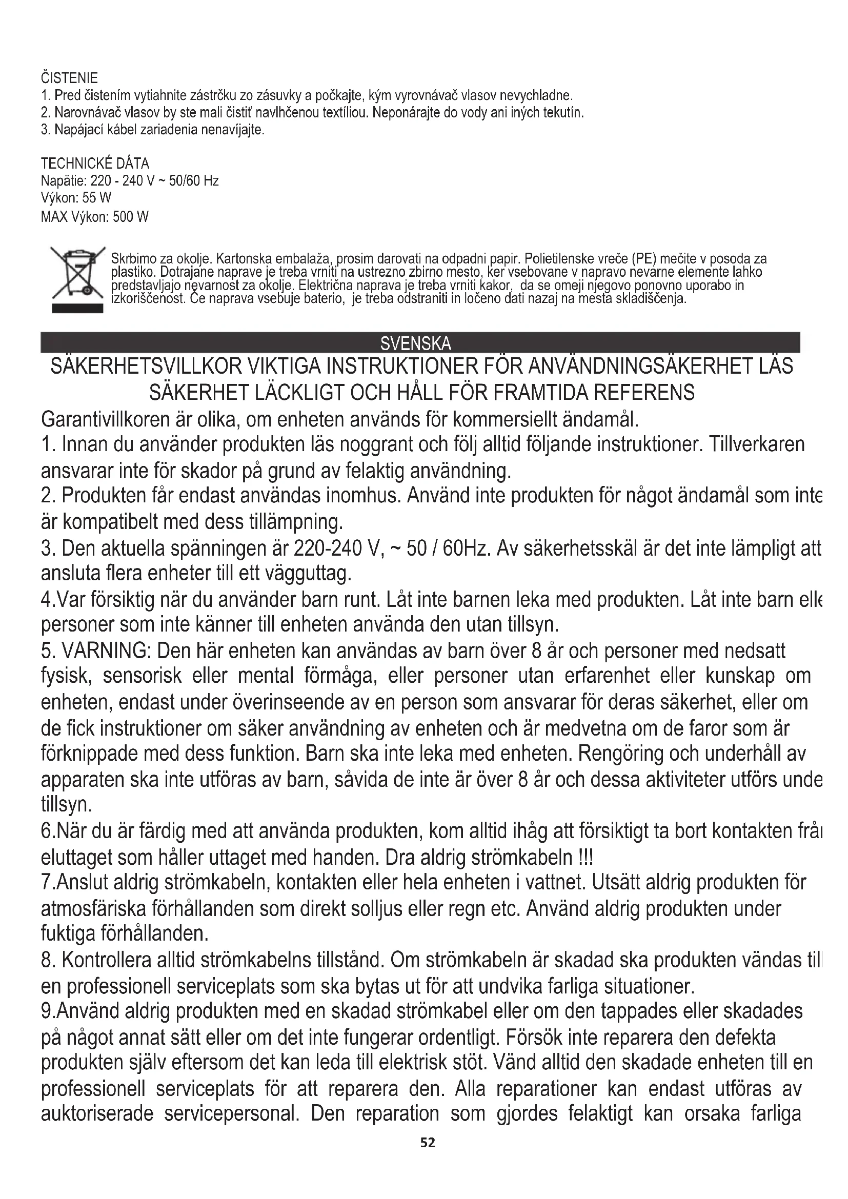 Vi sköter om miljön. Överlämna förpackningar i kartong till pappersavfall. Polyetylensäckar (PE) slängs i avfallsbehållare för plast. Man bör lämna en gammal apparat till en riktig återvinningscentral, eftersom farliga komponenter i apparaten kan orsaka fara till miljön. En elektrisk apparat bör lämnas för att minska förnyad användning av denna. Om apparaten innehåller batterier, bör man ta bort dem och lämna dem separat till återvinningscentraler. БЕЗБЕДНОСНИ УСЛОВИ ВАЖНА УПУТСТВА ЗА БЕЗБЕДНОСТ УПОРАБЕ ПРОЧИТАЈТЕ ПАЖЉИВО И ЗАЈЕДИТЕ ЗА БУДУЋУ РЕФЕРЕНЦИЈУ Услови гаранције су различити, ако се уређај користи у комерцијалне сврхе.